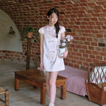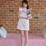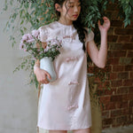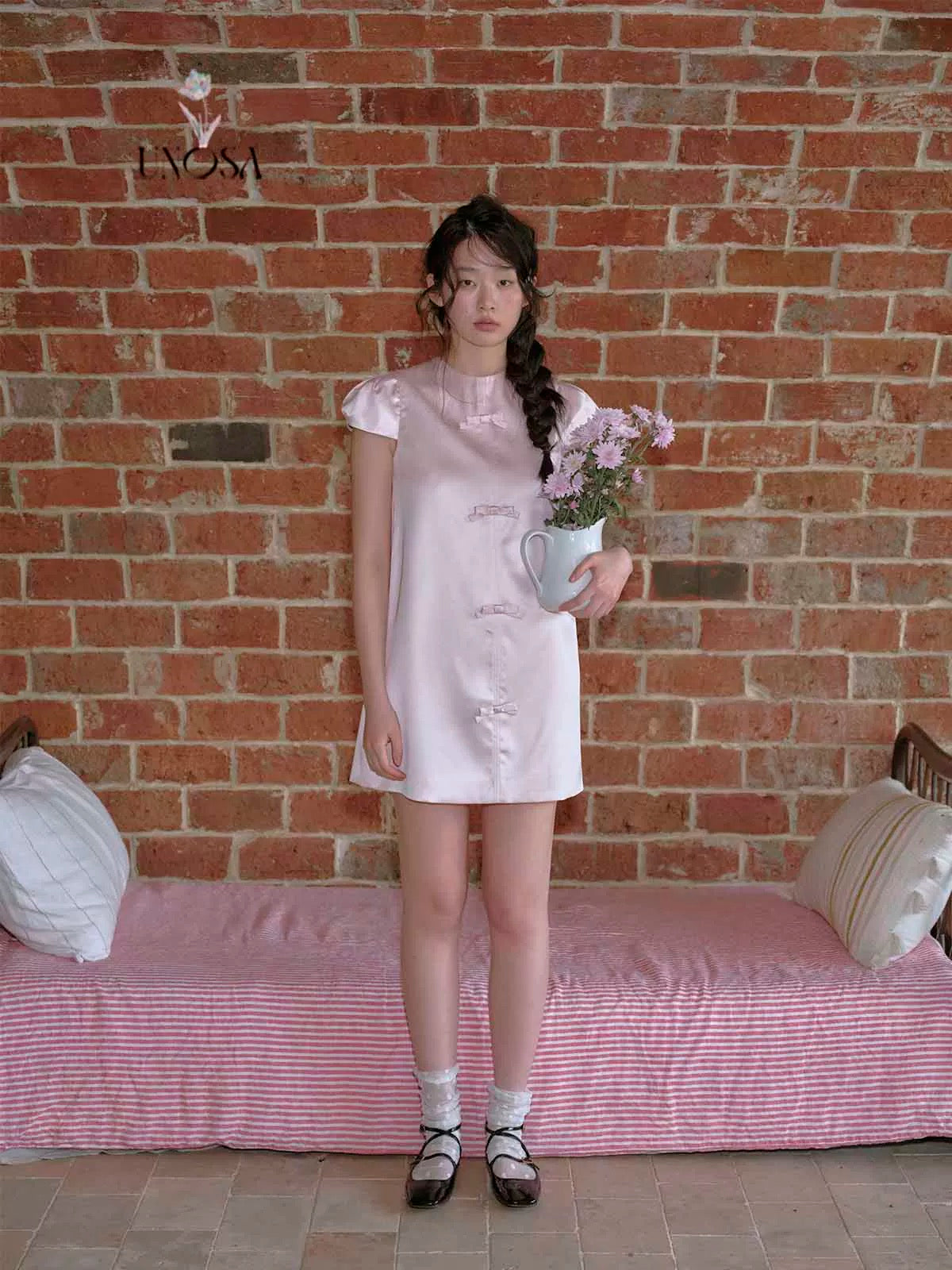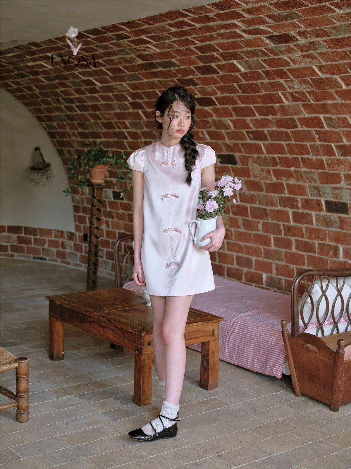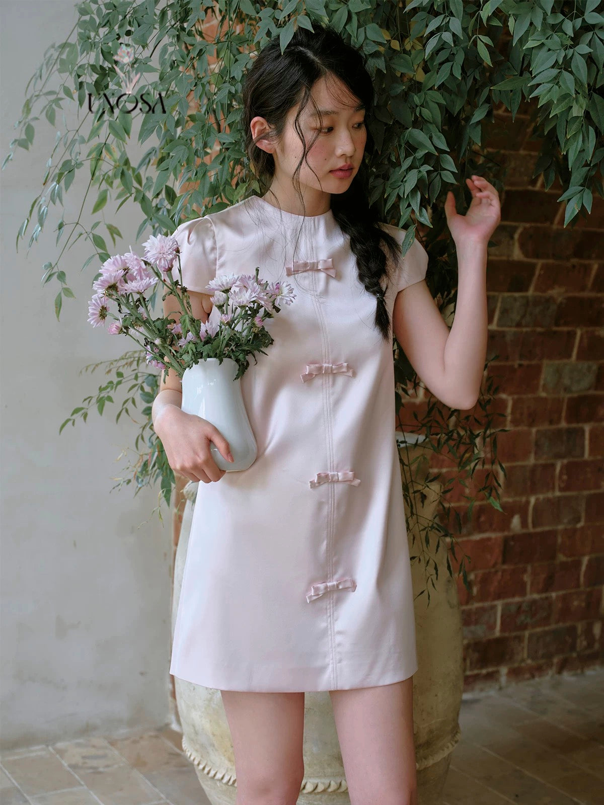 柔らかなパフスリーブと、チャイナドレス風のさりげないボタンディテールが特徴的なこのドレスは、ピクニックやガーデン散策、あるいはお家での素敵な気分転換にもぴったりです。レースソックスとメリージェーンシューズを合わせたり、ふんわりとしたイブニングルックにドレスアップしたり。シルクのしなやかな襞一つ一つに、若々しい優雅さがささやきます。
