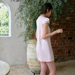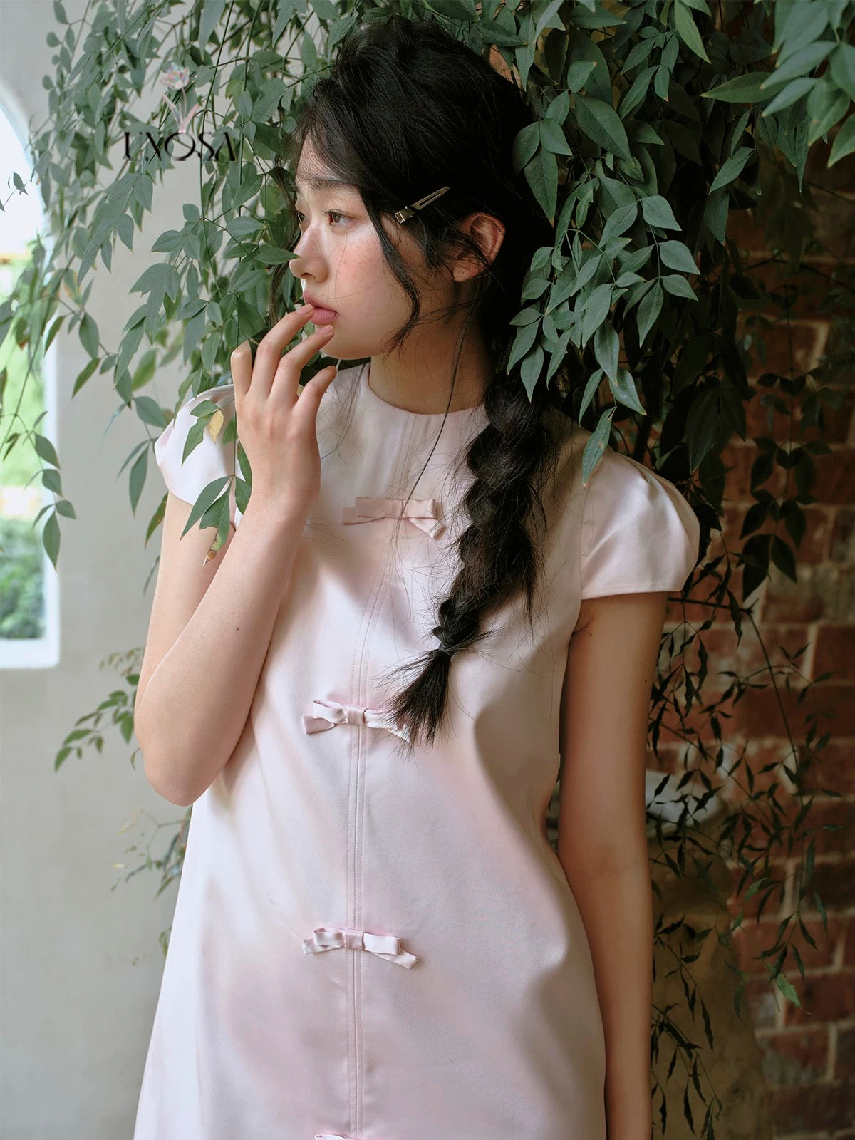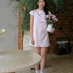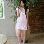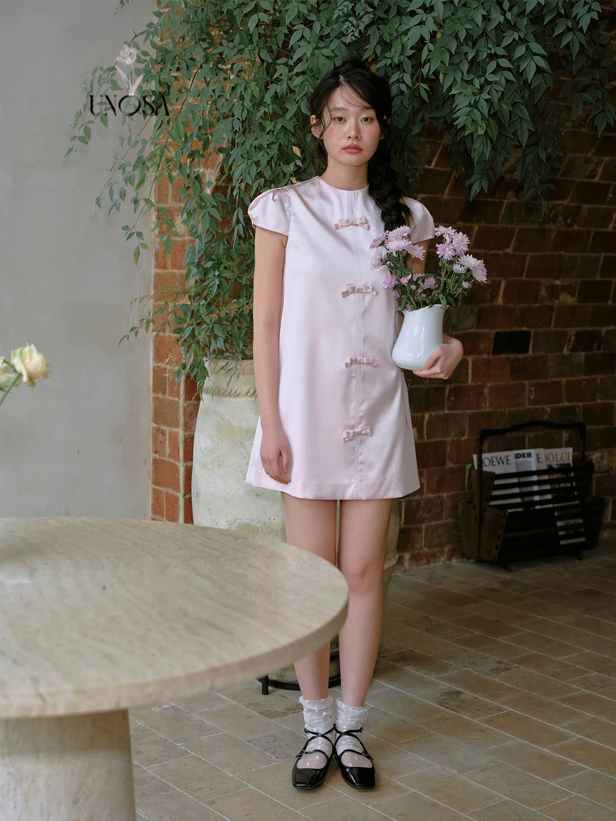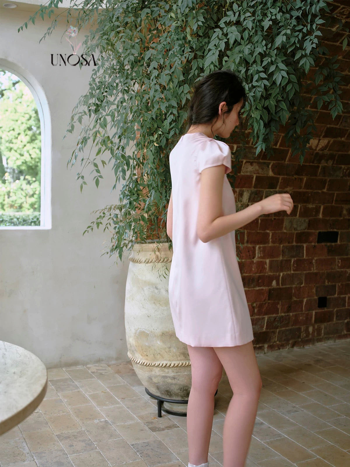 UNOSAのサテンロゼミニドレスで、夢の世界へ足を踏み入れましょう。繊細なラグジュアリーとコケットコアな魅力が甘く融合したドレスです。上質なサテンを使用し、肌に月光のように柔らかな感触を放つこのパステルピンクのミニドレスは、春の朝の無邪気さとヴィンテージロマンスの優雅さを体現しています。