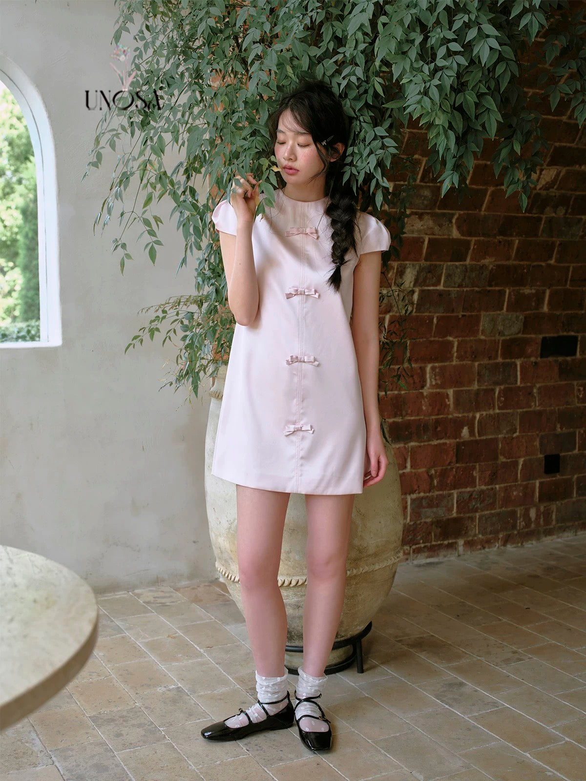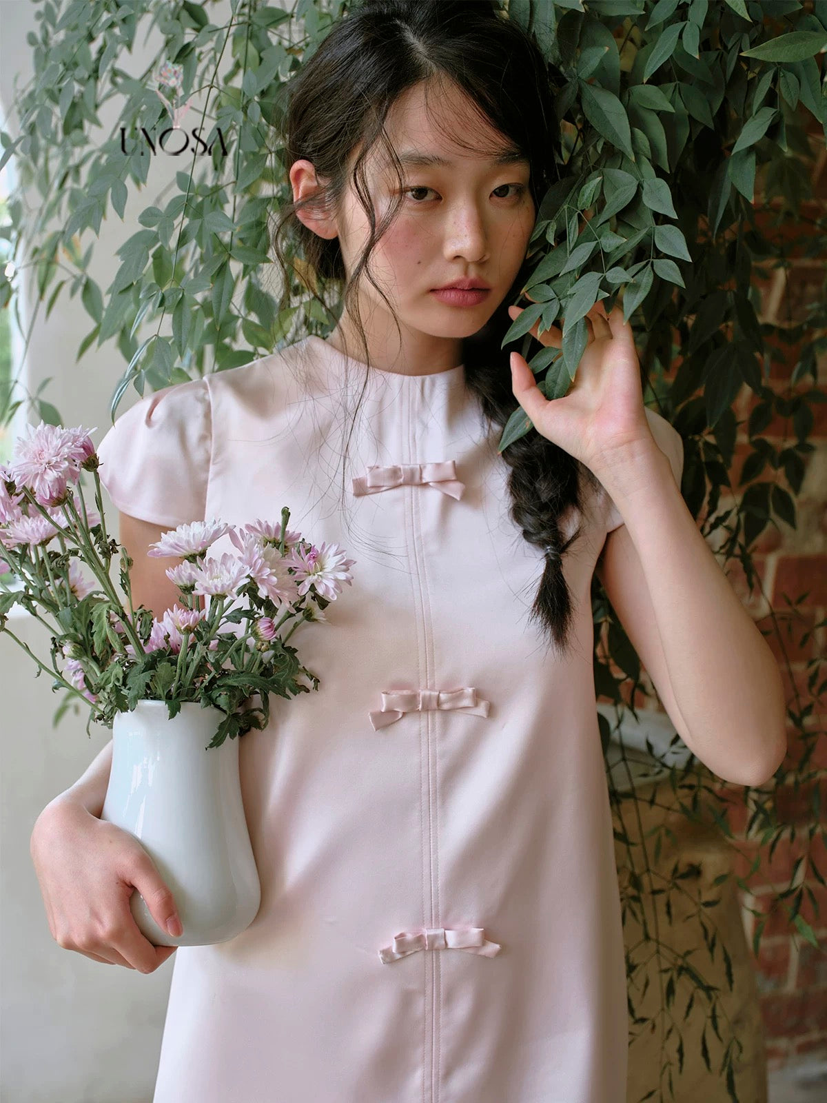 ローブ ミニ サテン ロゼ ドゥ ウノサの放任主義 — 最高の品質を追求したドレスを着てください。繊細なバラのパステルと女性の魅力を表現します。