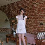 チャイナ風のボタンディテールや、ふんわりとしたパフスリーブが愛らしさをプラス。お散歩やカフェタイム、おうちでのんびり過ごす日にもぴったりな一枚です。