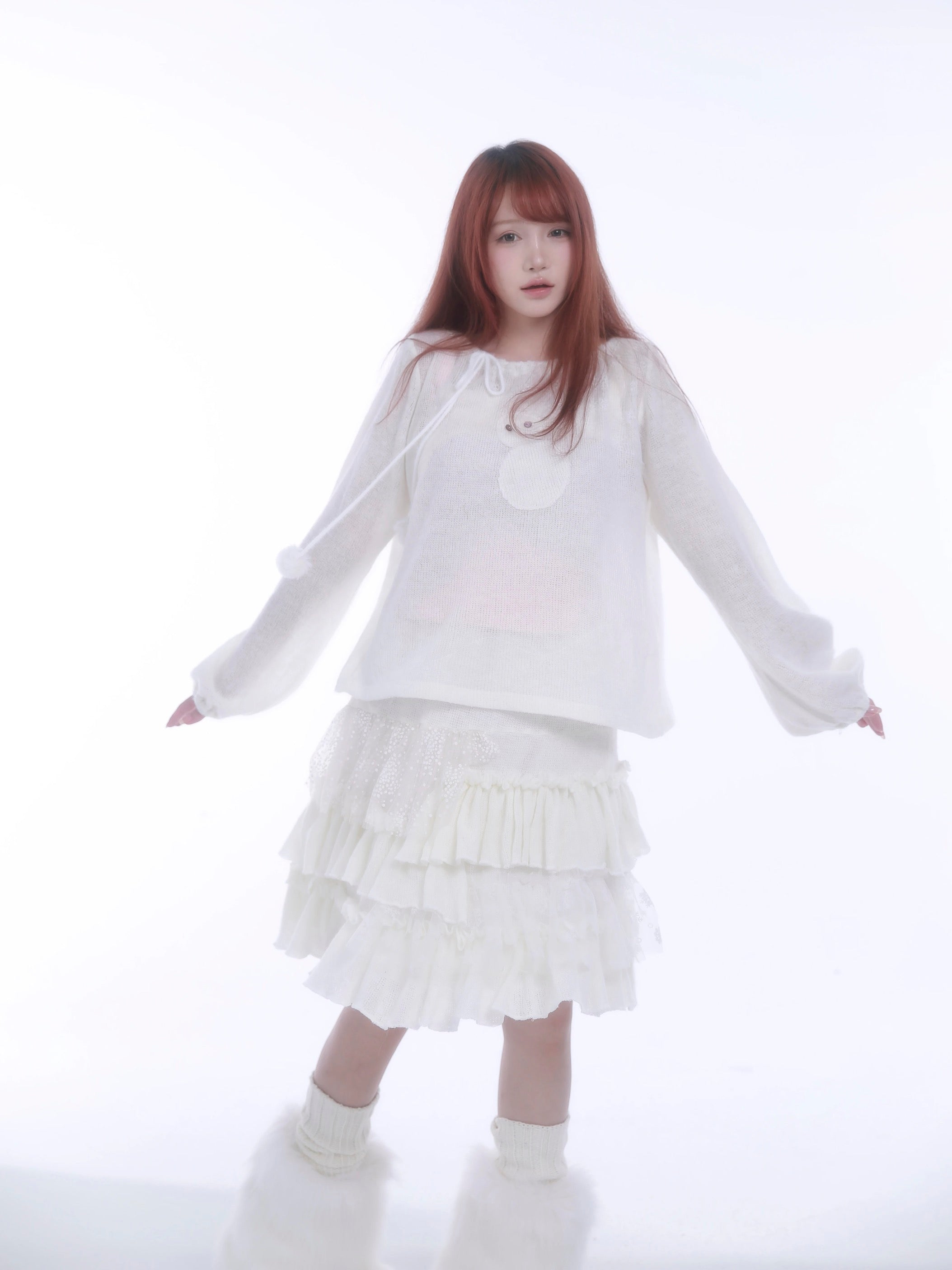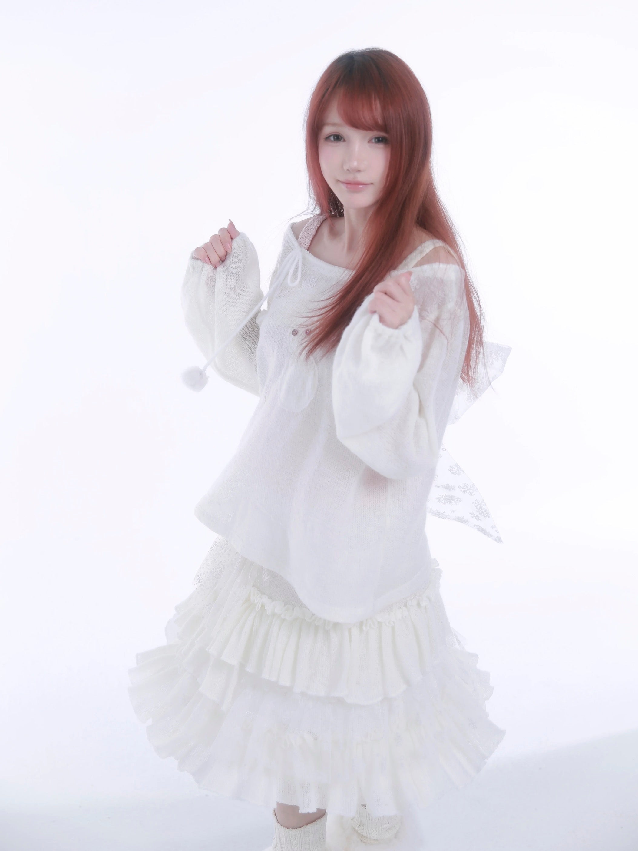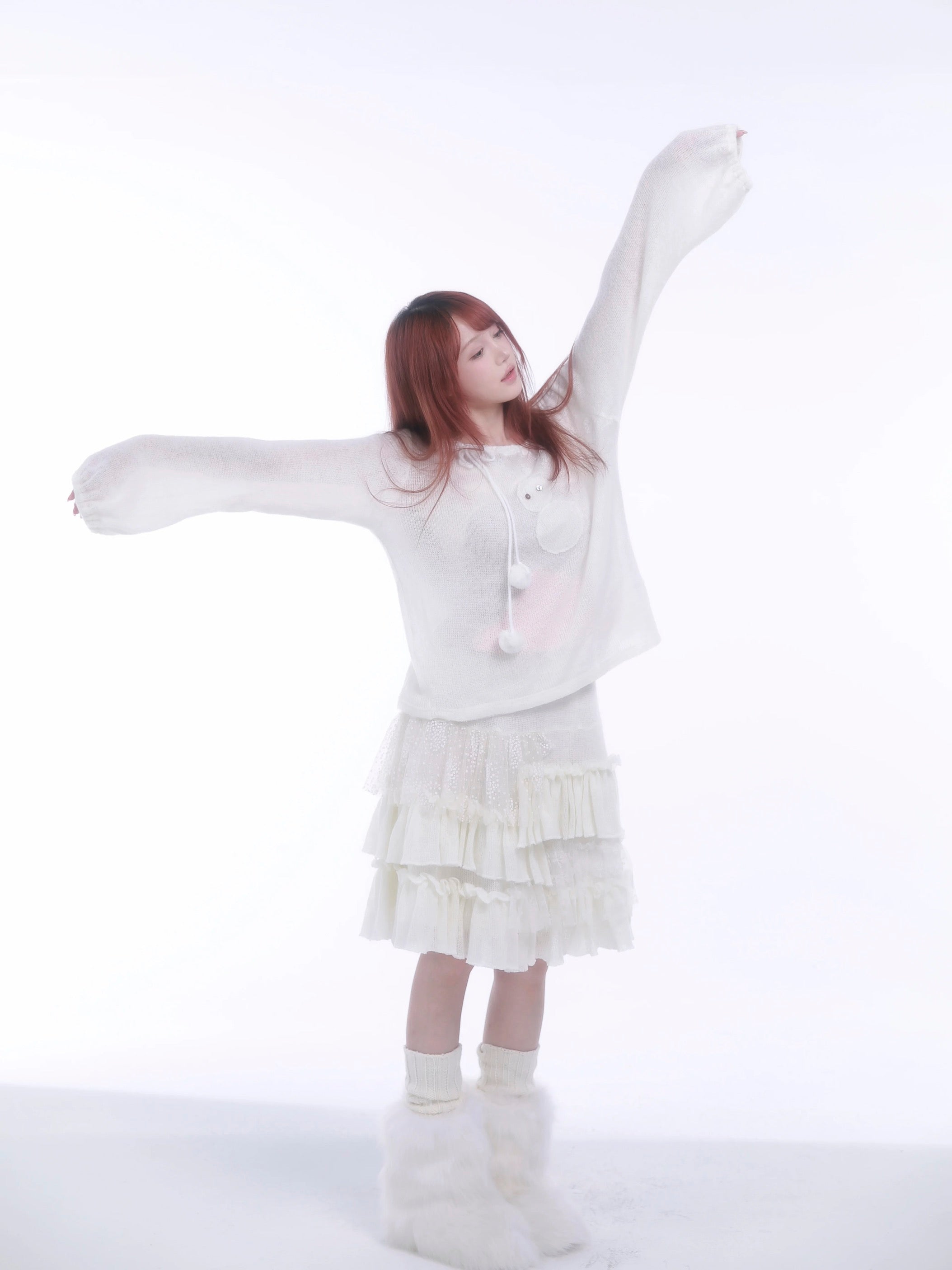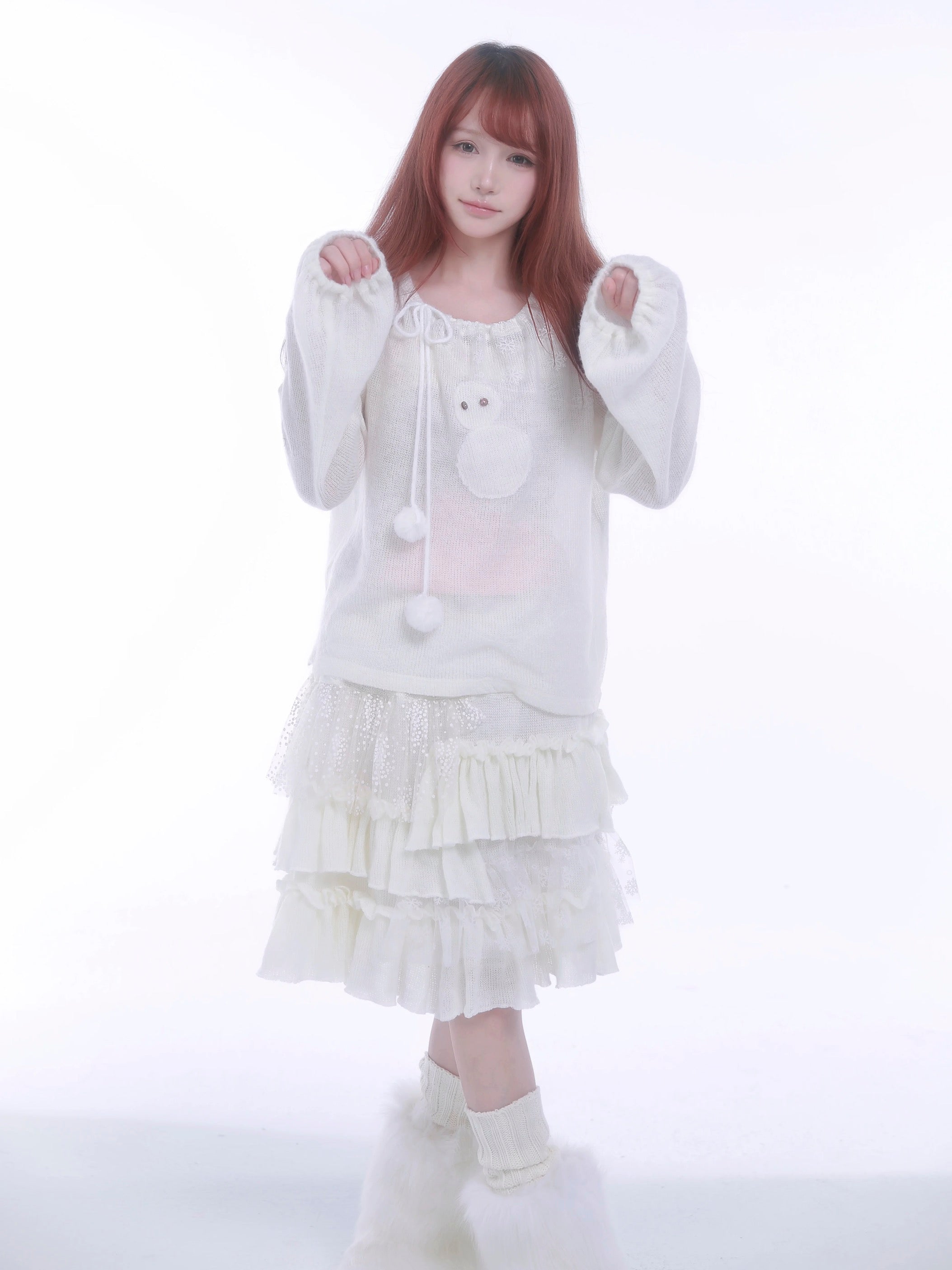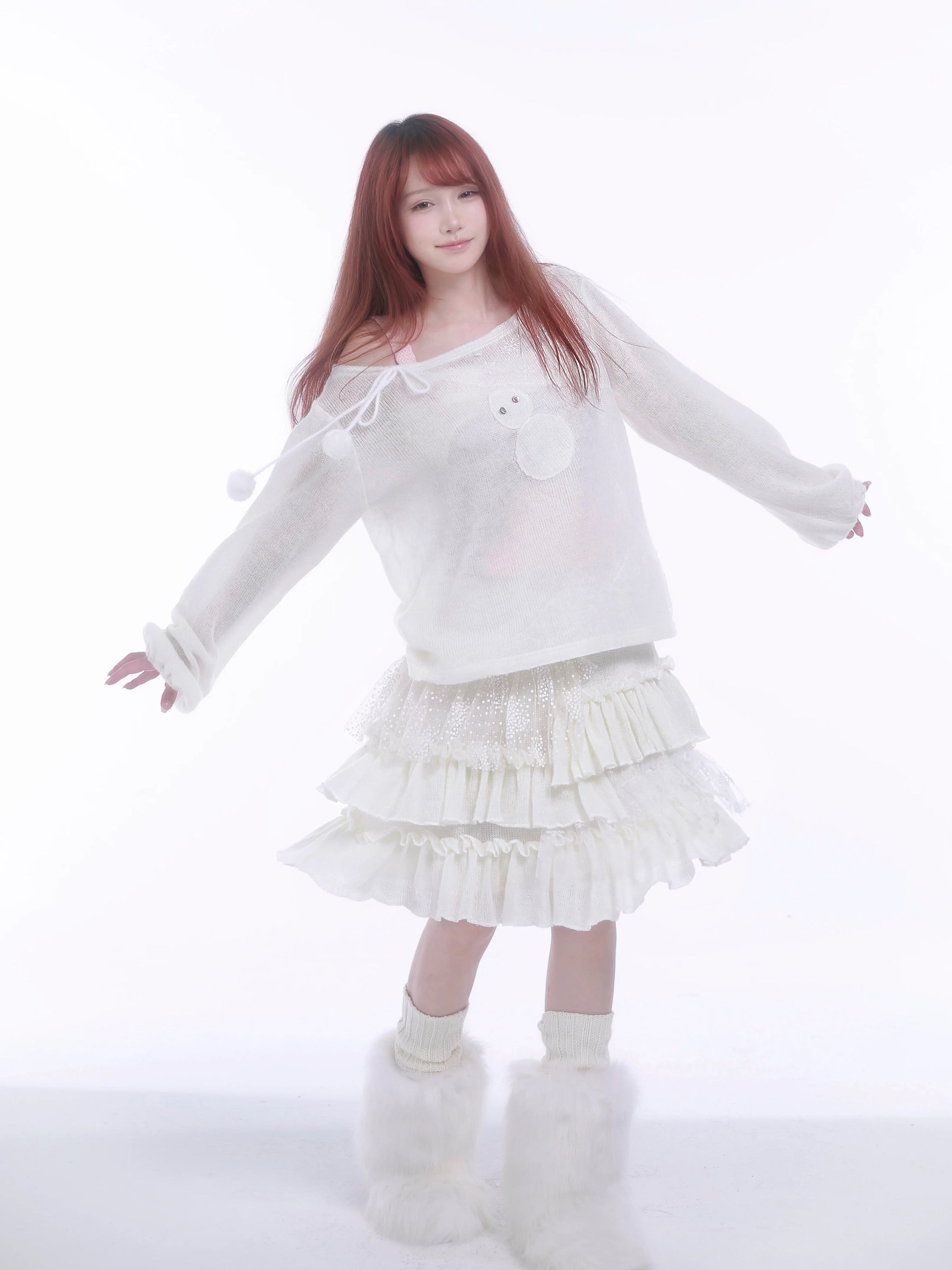 ドローストリングネックラインは、オフショルダー、ワンショルダー、レギュラーの3つのスタイルに調節できます。パフスリーブ、ポンポン、ふわふわのリボン、そしてフロック加工された雪の結晶が、繊細で夢のような雪だるまのようなルックを演出します。