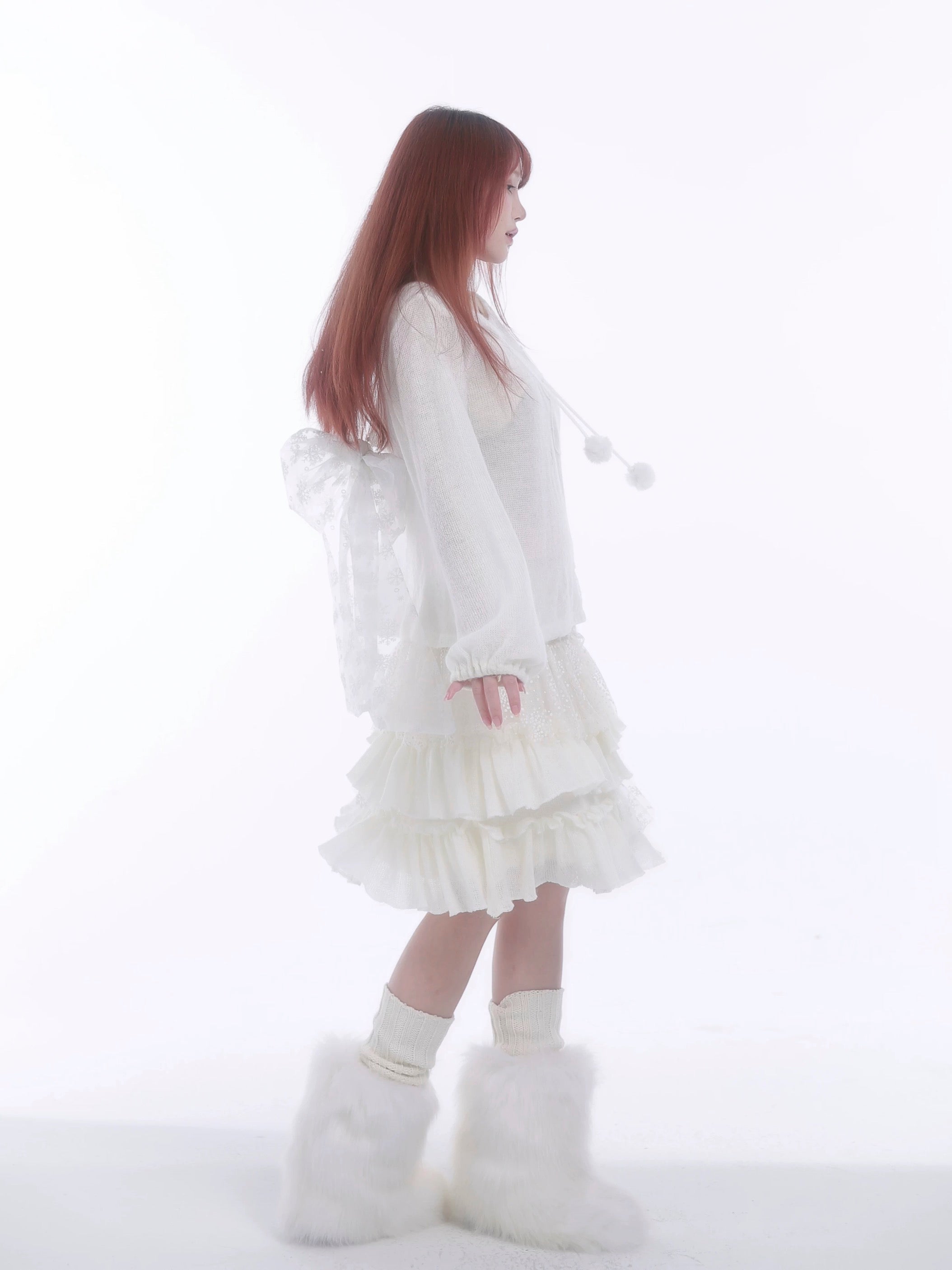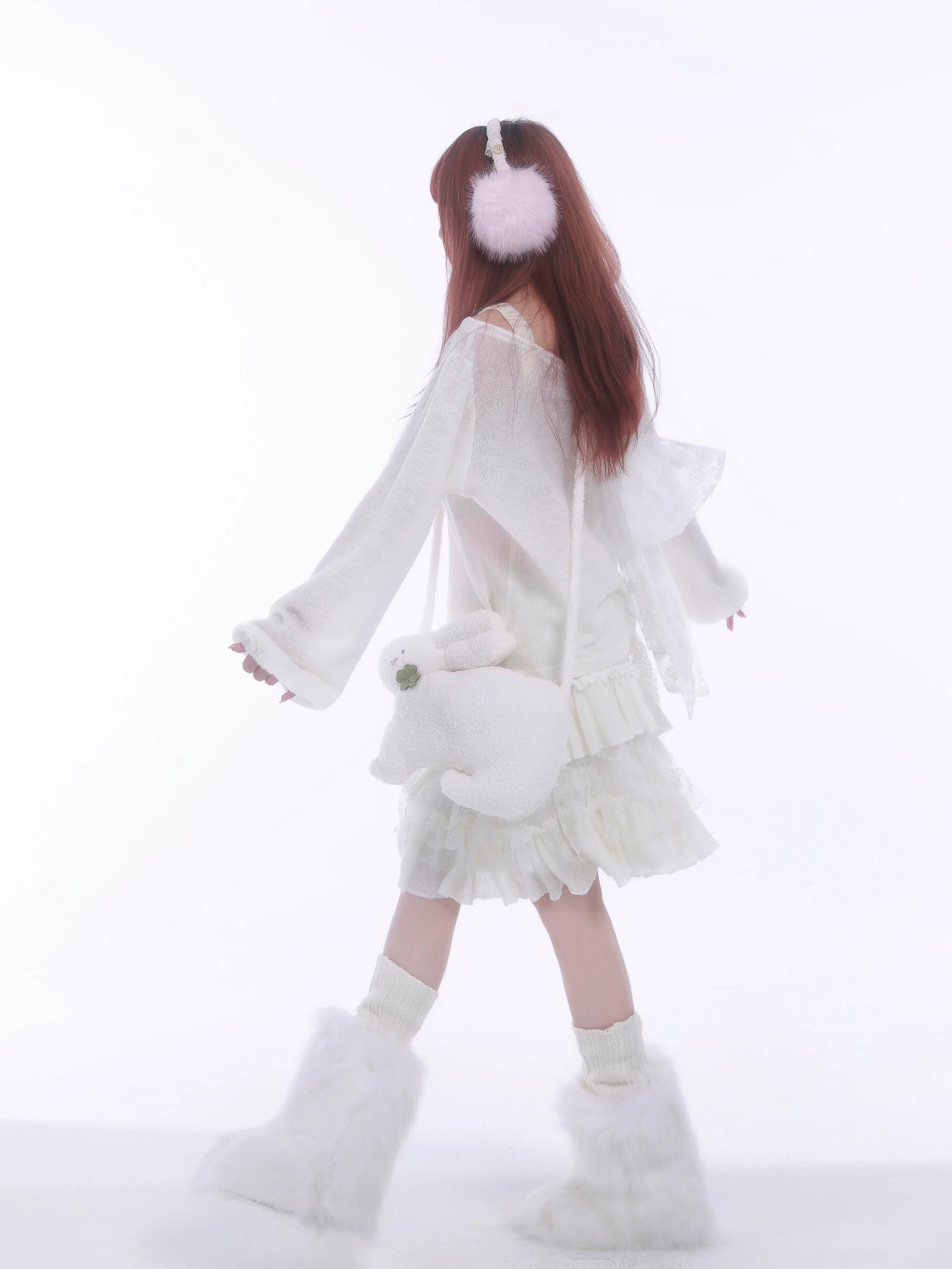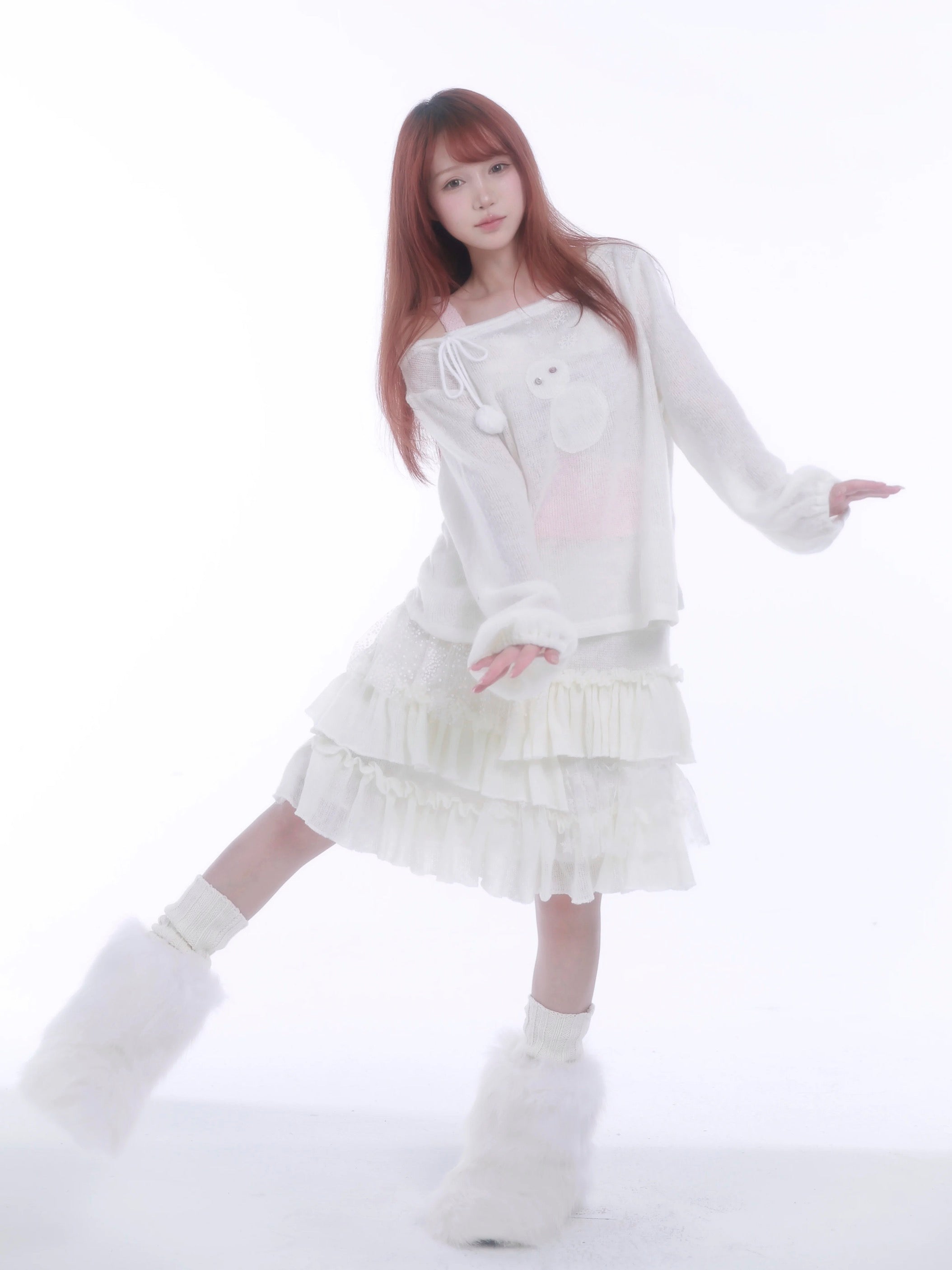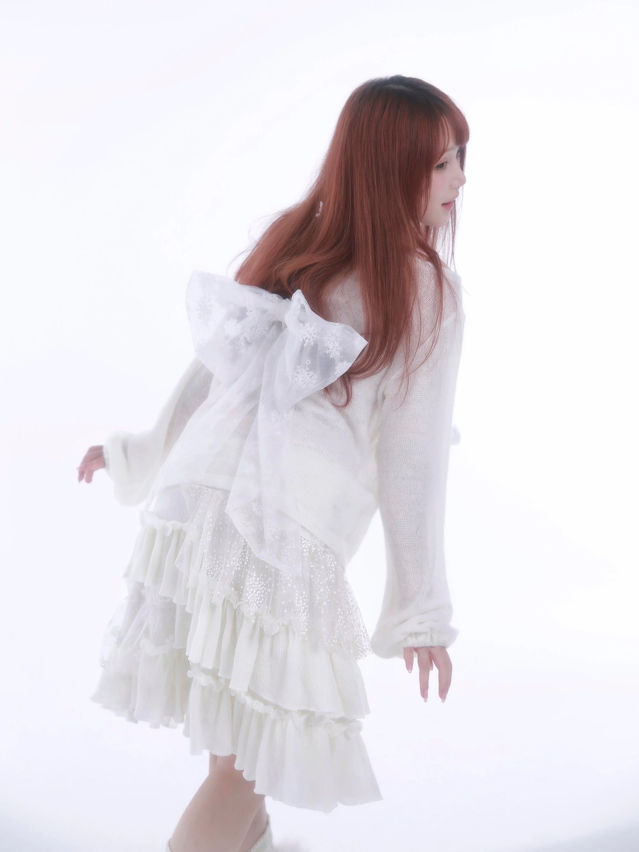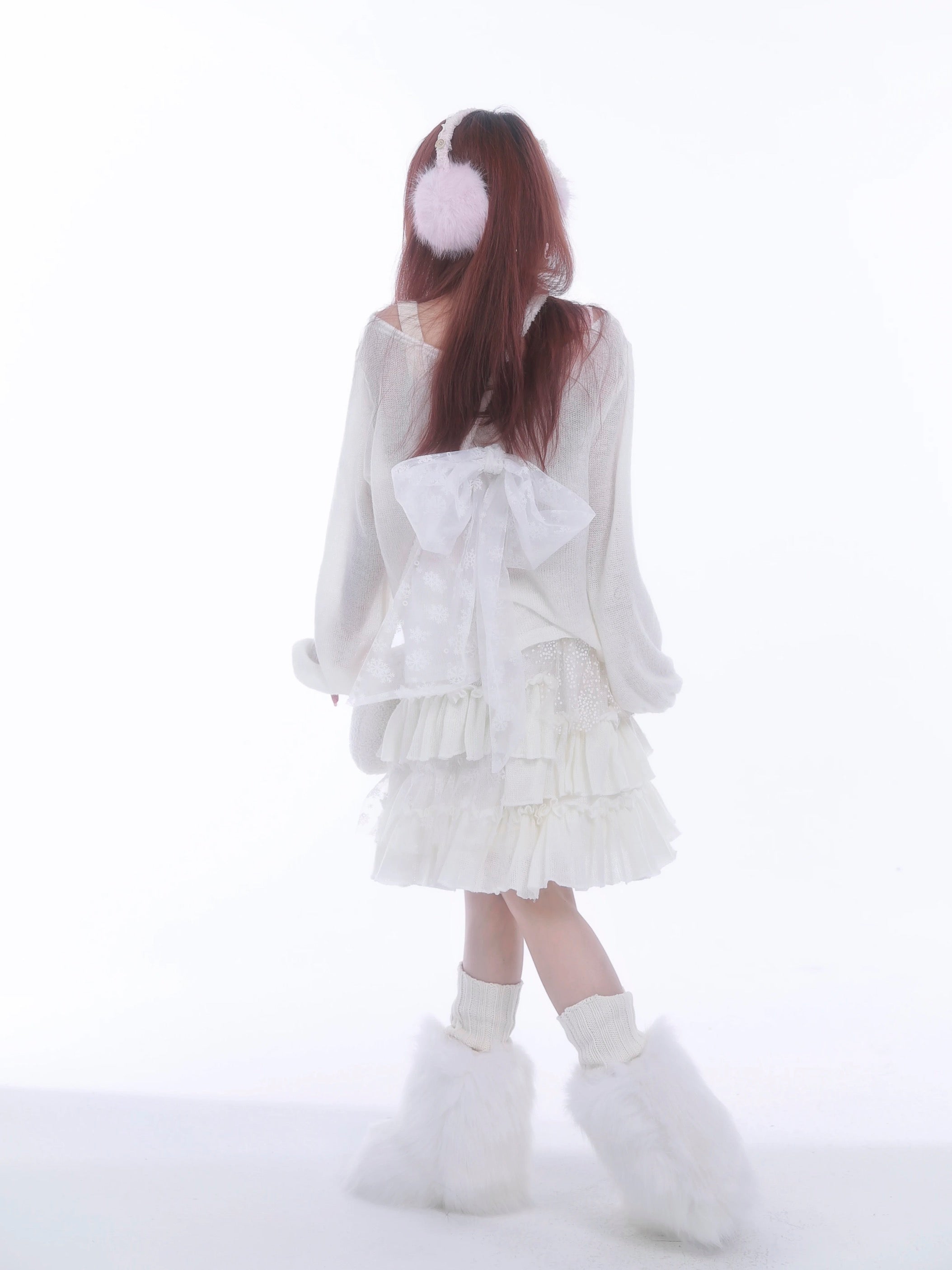 ドローストリングネックラインは、オフショルダー、ワンショルダー、レギュラーの3つのスタイルに調節できます。パフスリーブ、ポンポン、ふわふわのリボン、そしてフロック加工された雪の結晶が、繊細で夢のような雪だるまのようなルックを演出します。