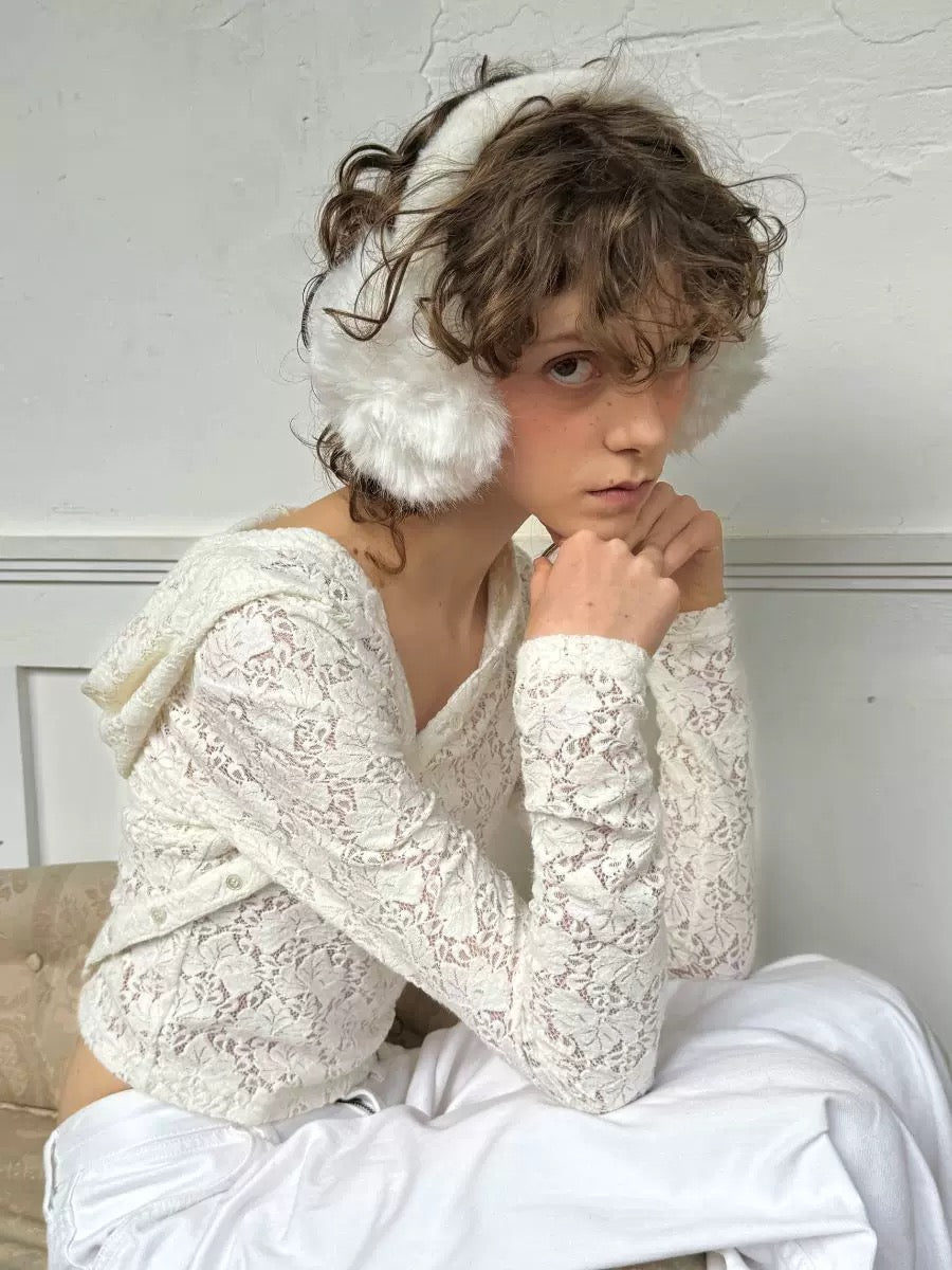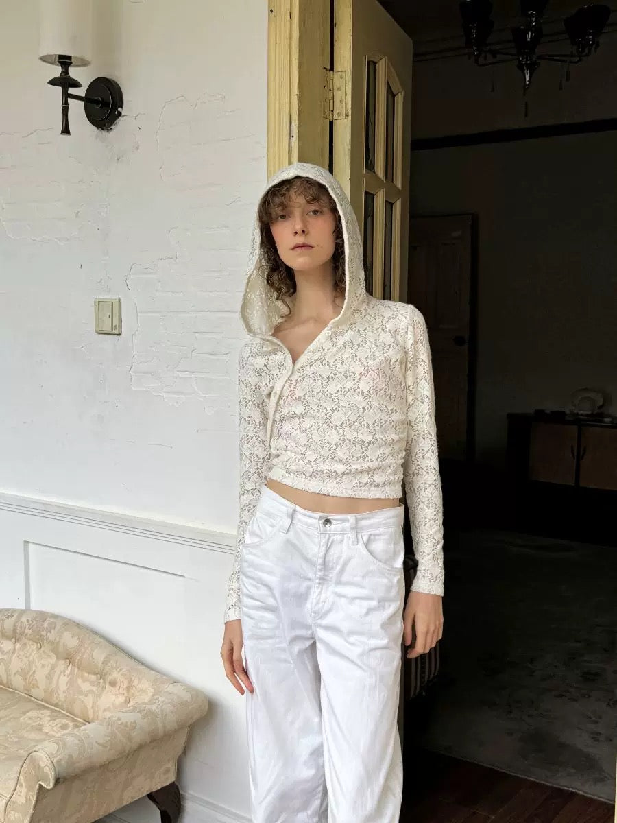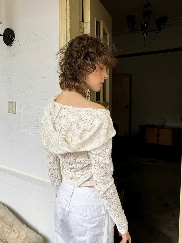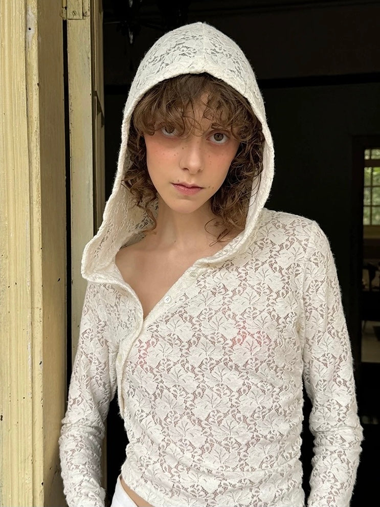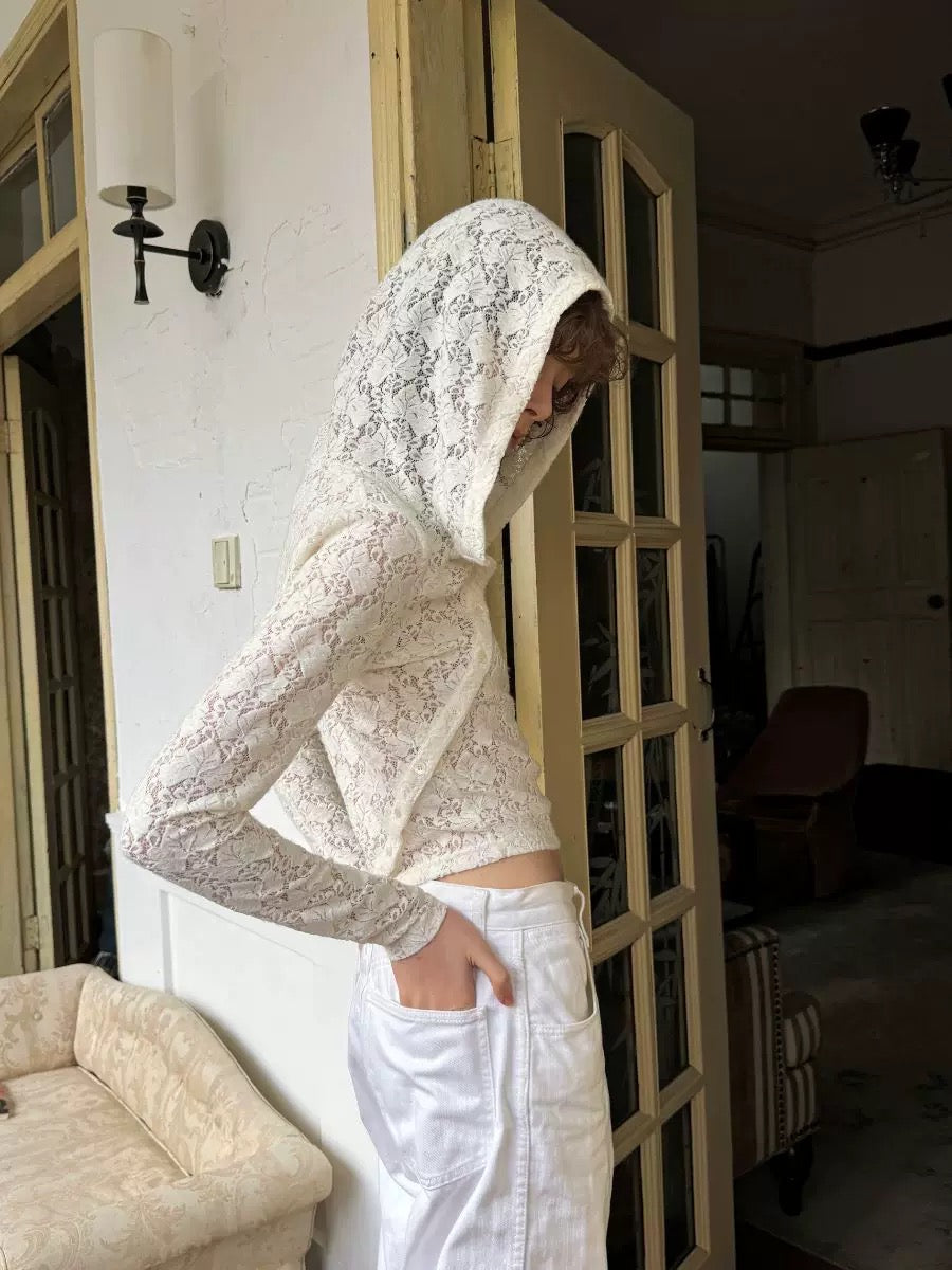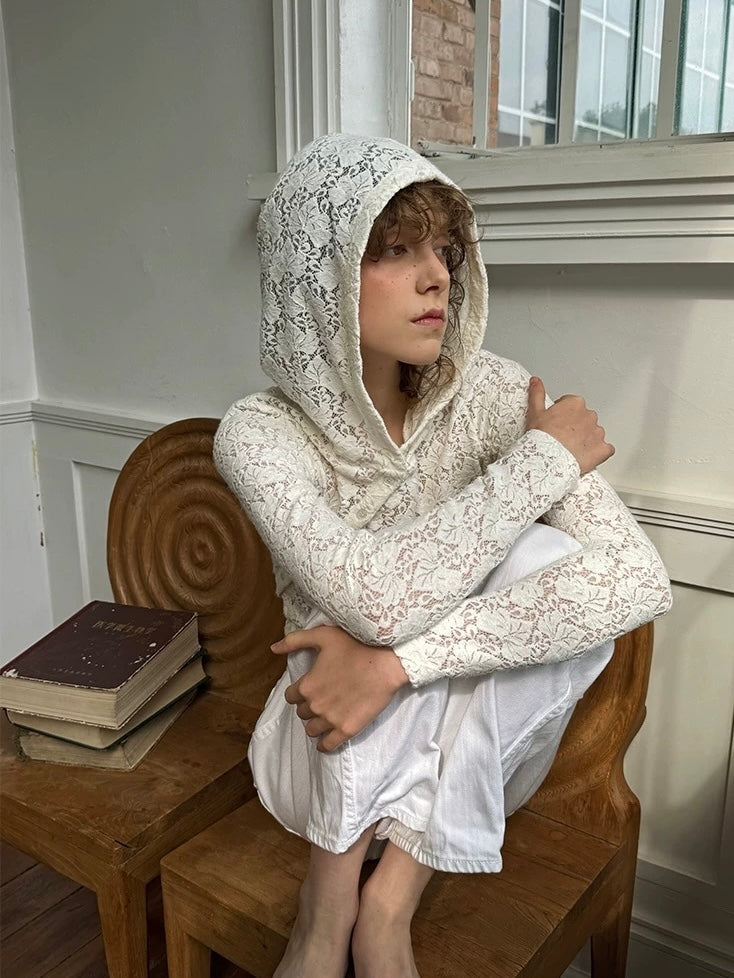 Crafted from a delicate blend of nylon, chenille, and spandex, this lace-trimmed hooded knit top reimagines the classic layering piece with a romantic and modern twist. The slim-fit silhouette features long sleeves and a softly contoured hood, offering a flattering shape without feeling restrictive. Subtle pleating at the waist enhances the natural curves and visually elevates the waistline for a more sculpted look.