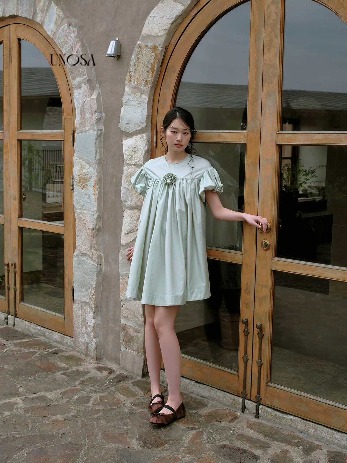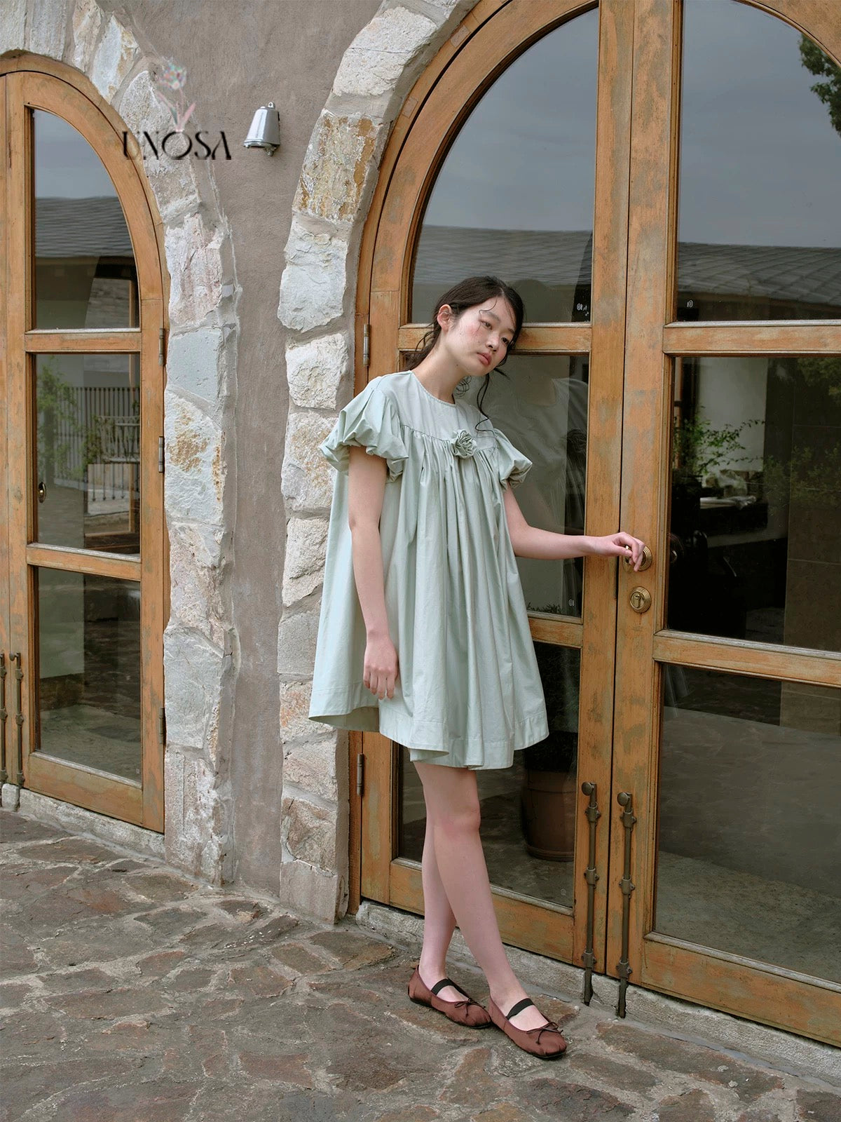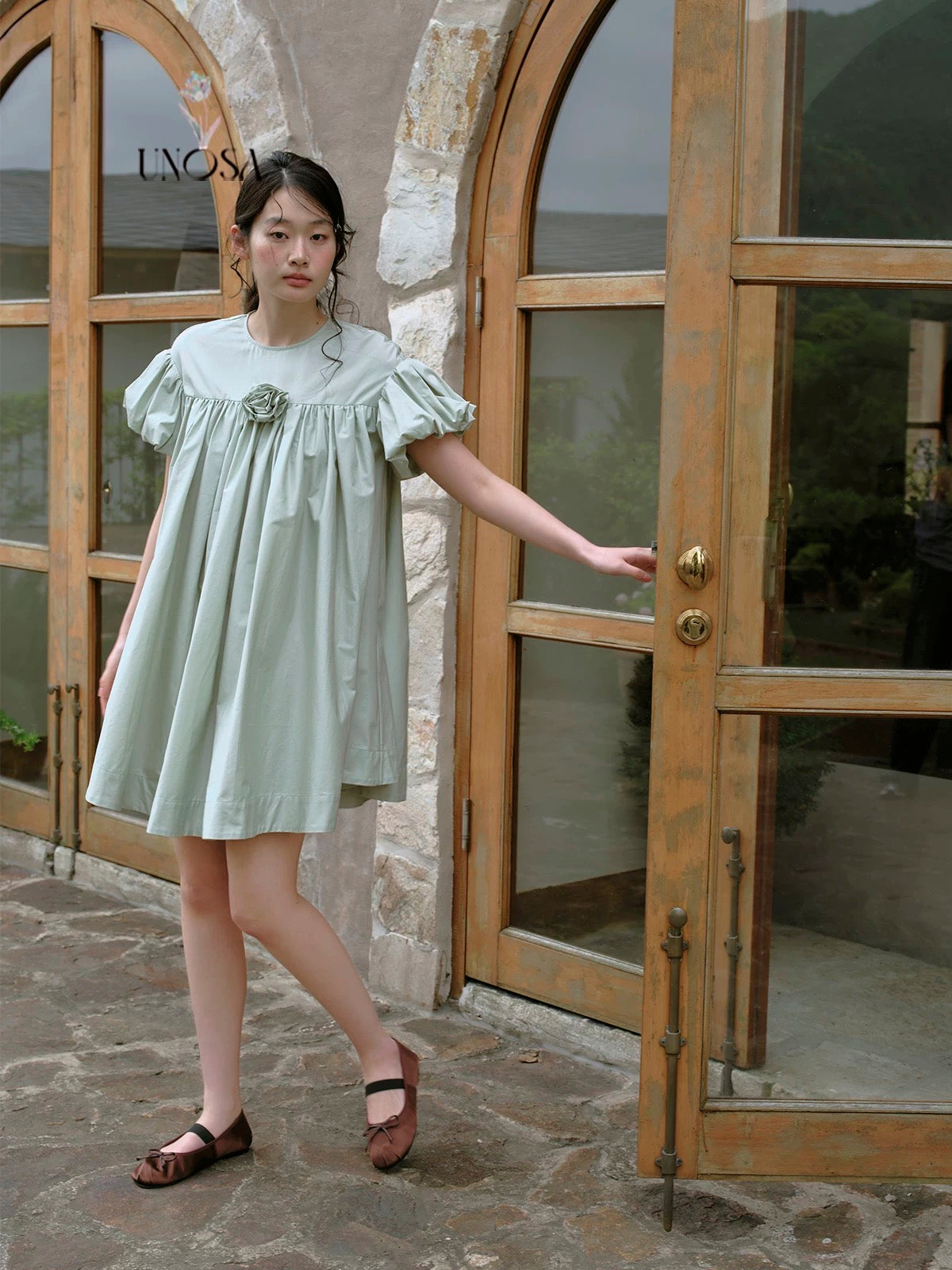 ミントグリーンとパフスリーブで、柔らかなティータイムドールルックを演出