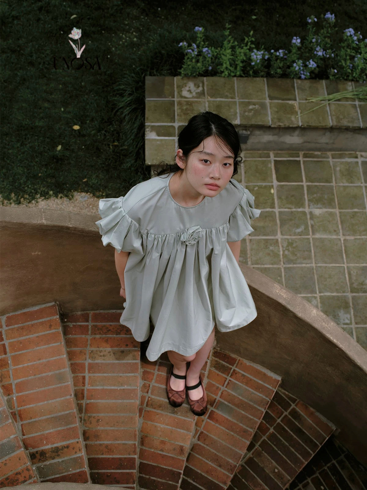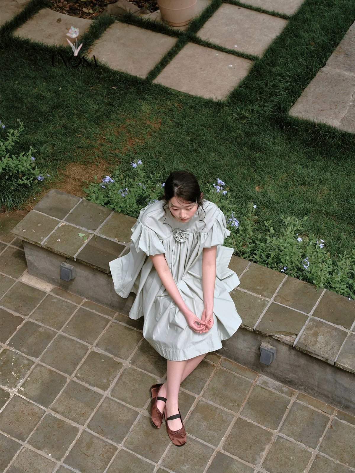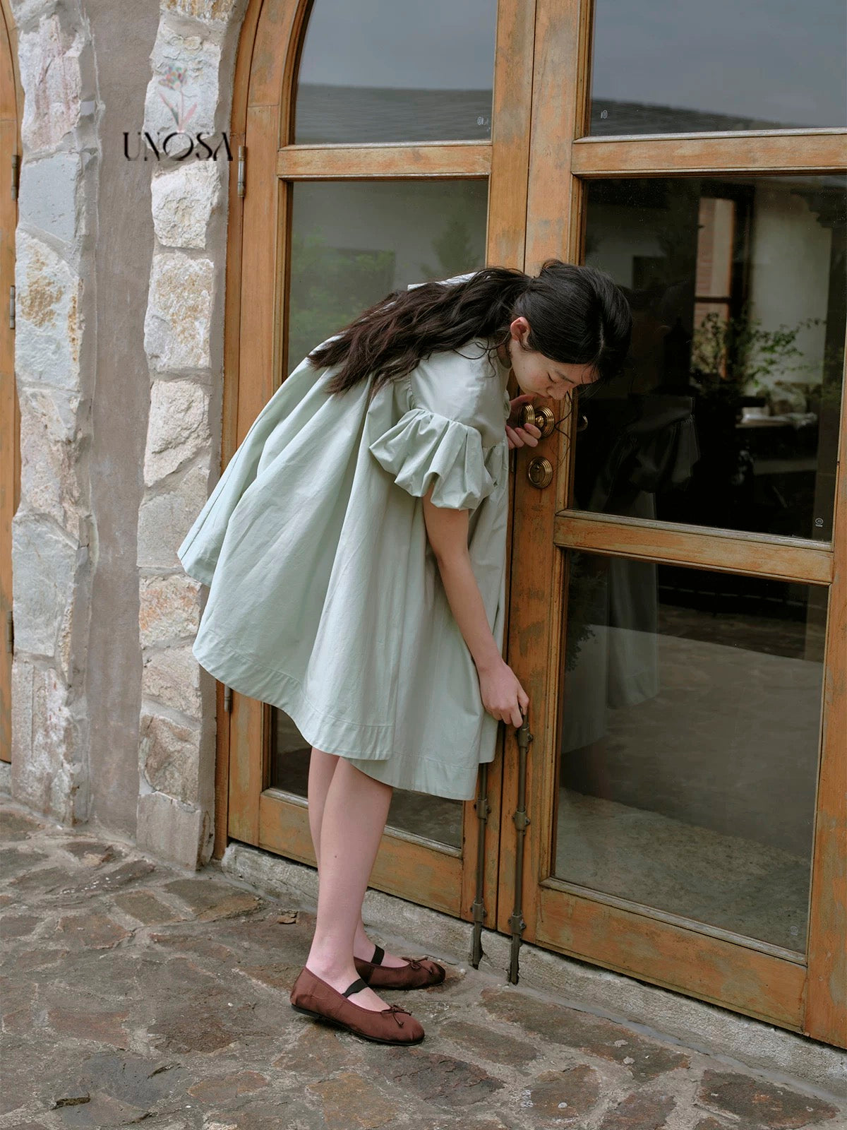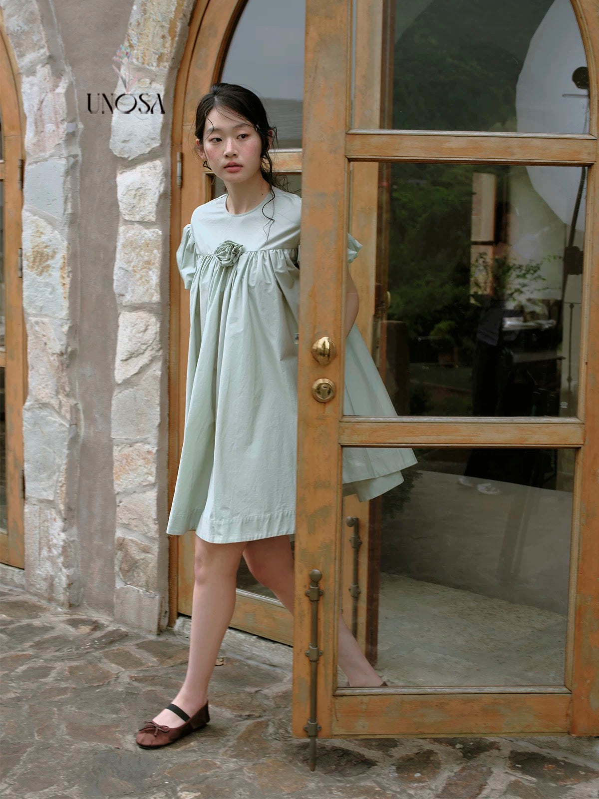 ミントグリーンとパフスリーブで、柔らかなティータイムドールルックを演出