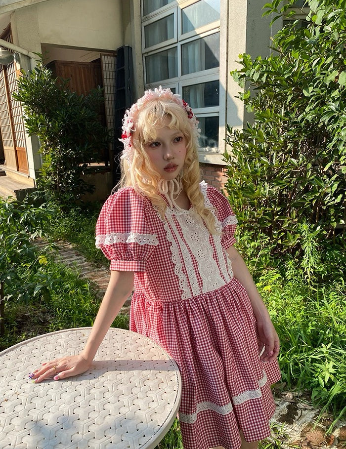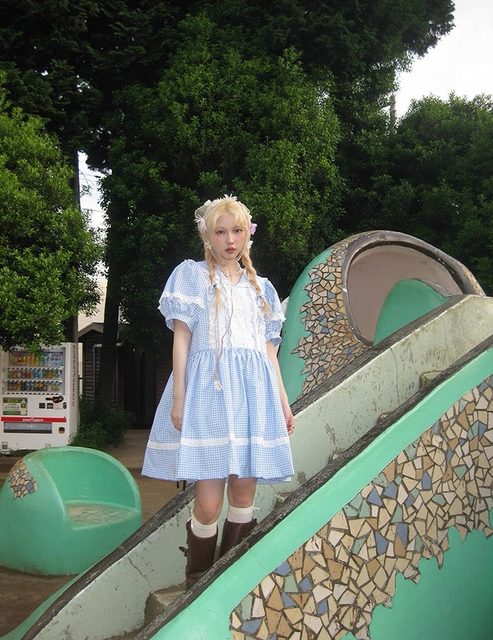 August Unicorn Gingham Sailor Puff Sleeve Dress