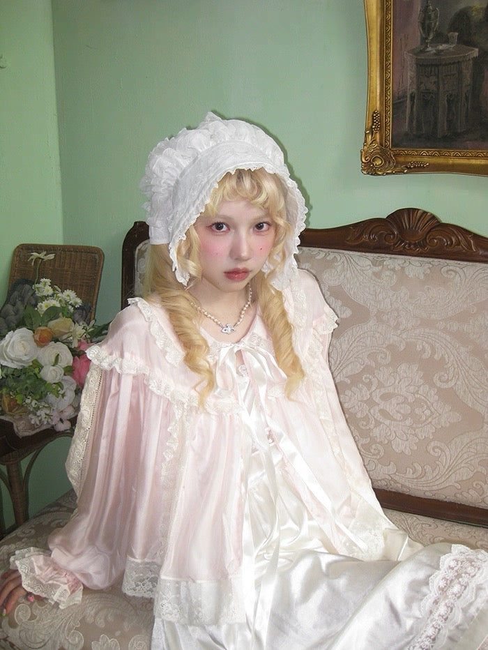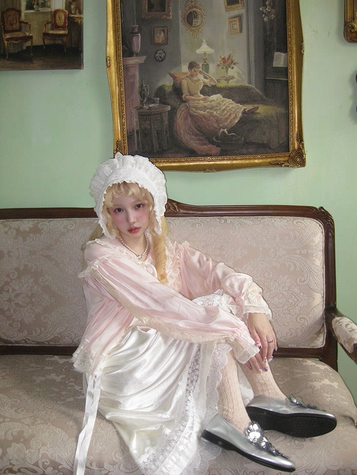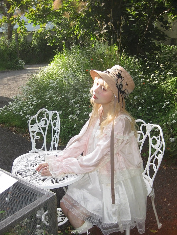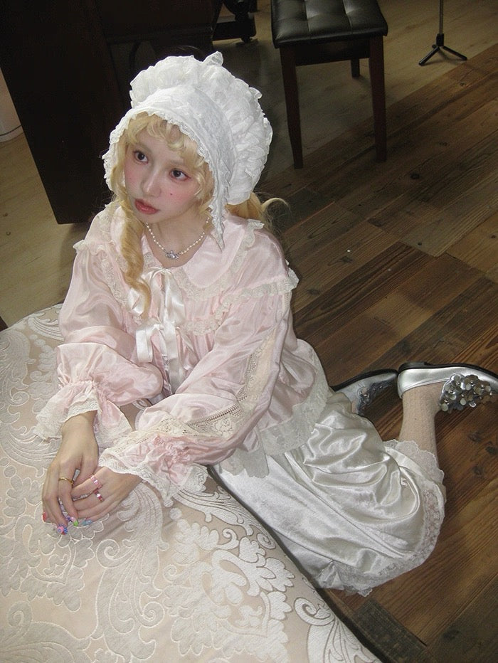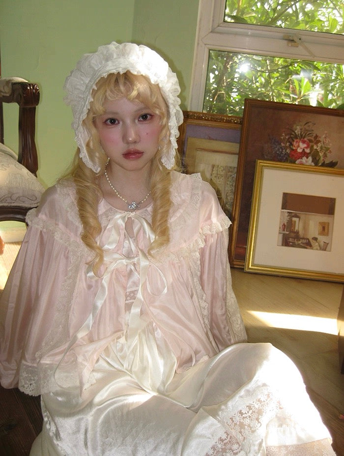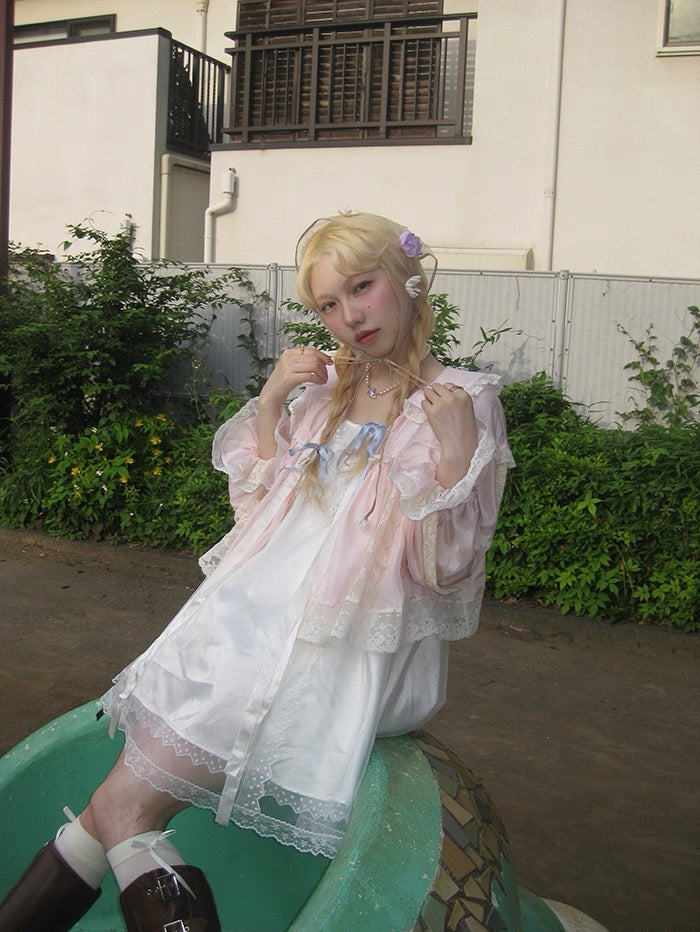 Soft as a lullaby and sweet — the Doll Core Silk Blouse is a handcrafted treasure made from 100% pure silk, designed for layering, styling, and daydreaming. With its elegant puff sleeves, antique lace trims, and satin ribbon bows, this versatile piece can be worn as a lightweight cardigan or a romantic blouse.