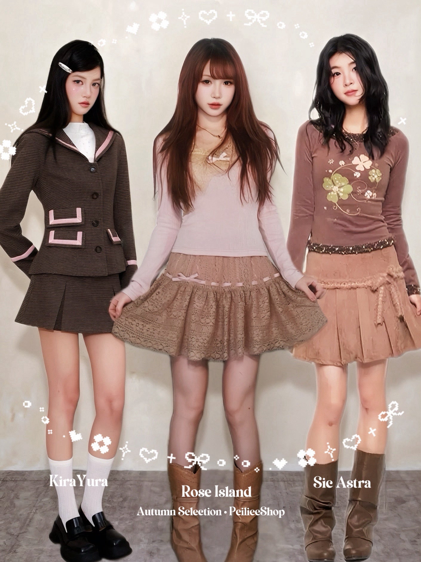 Warm mocha tones, lace layers, and playful pleated skirts create a dreamy fall aesthetic — soft, romantic, and a little retro ✧˖°🍂✨