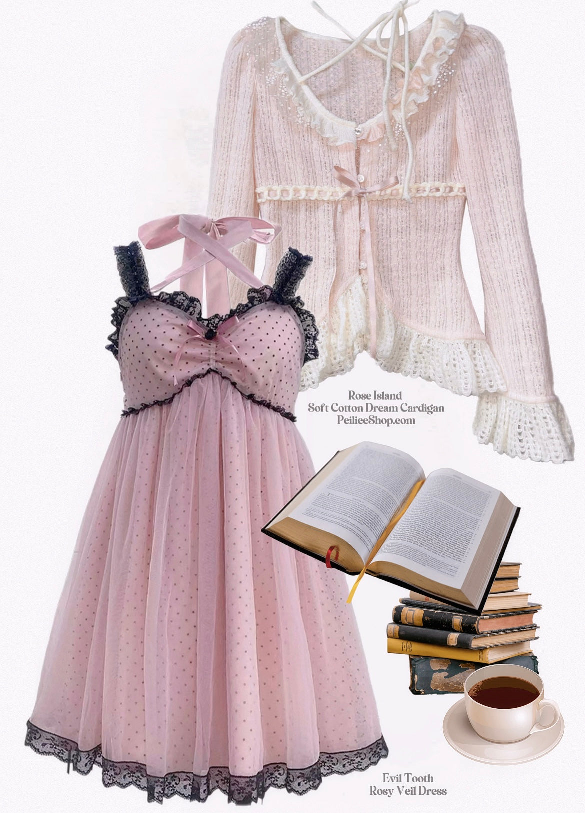 A soft cardigan layered over the dreamy Rosy Veil Dress, perfect for cozy reading hours and tea time daydreams. Delicate lace, pink bows, and sheer layers make every page turn feel like a fairytale ✧˖°💌