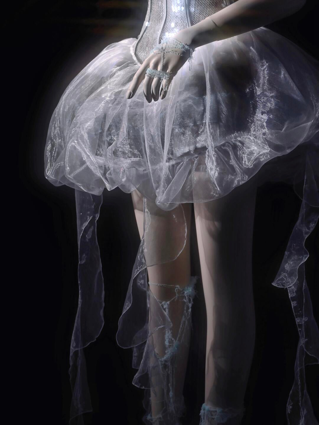幾重にも重なったプリーツと柔らかくきらめく生地が、クラゲの流れるような腕をイメージした繊細なブルーのレースと融合。しっかりとした作りでありながら、軽やかでエアリー、そしてセミシースルーのコルセットは、ボーンが重たさを感じさせず、シェイプアップ効果も抜群です。