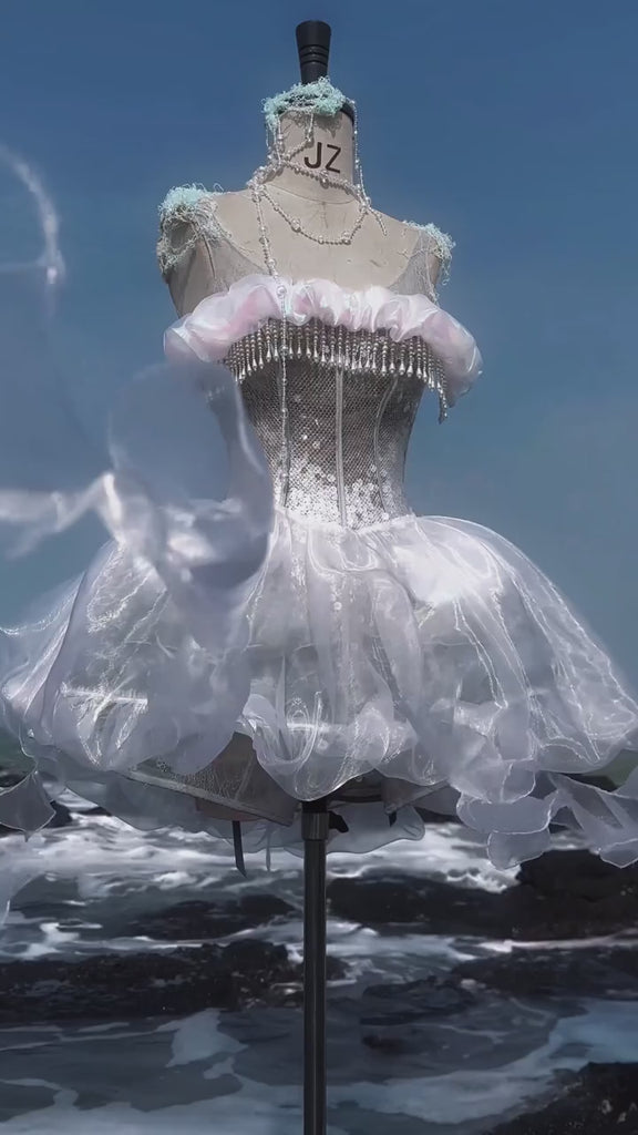 21本の曲線を描くボーンラインを巧みに配したユニークなバードケージデザインが、ボディラインを優しく包み込み、美しい砂時計のようなラインを描きます。バスト部分には、虹色に輝くメッシュを二重に重ね、柔らかな海の泡を思わせるデザイン。パールのタッセルトリムは、水面に舞う泡のように揺れ動きます。