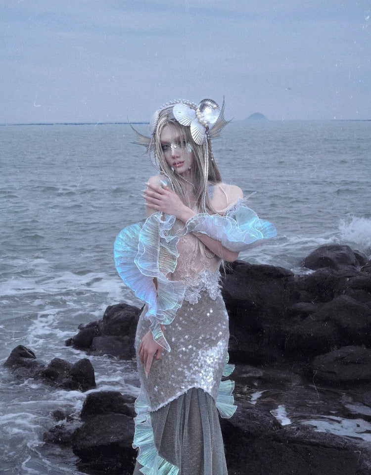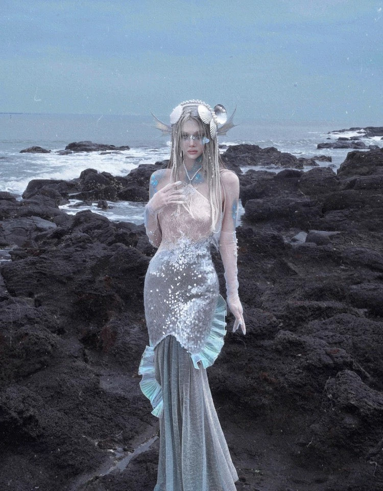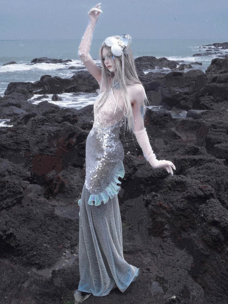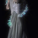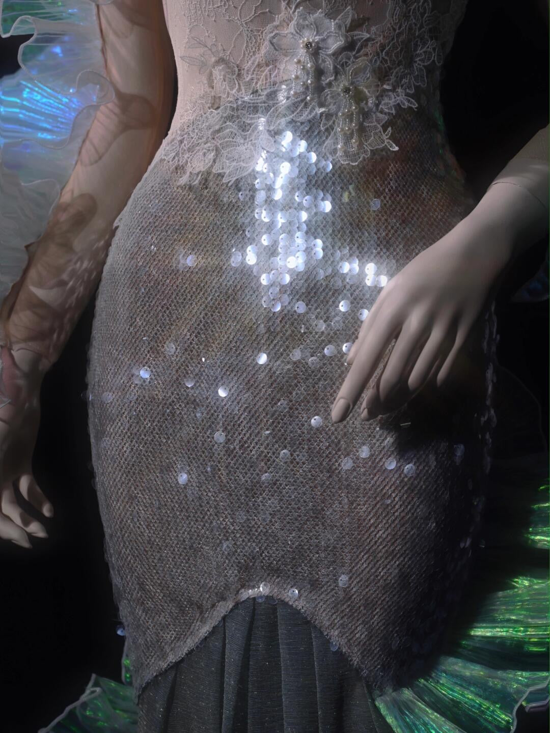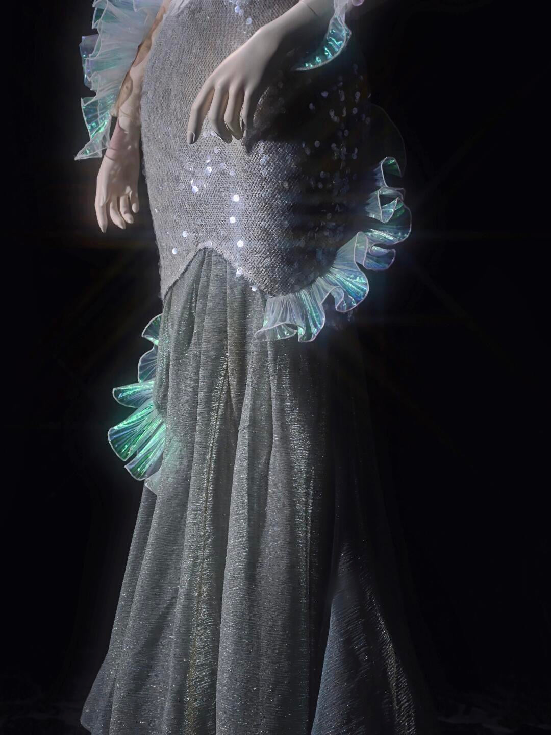 きらめくスパンコールメッシュが、海の波のように光を捉えます。裾の虹色に輝く生地はツートンカラーで輝き、歩くたびに魔法のような雰囲気を醸し出します。フリルのサイドパネルは、まるで人魚のヒレのように優雅に揺れ動きます。