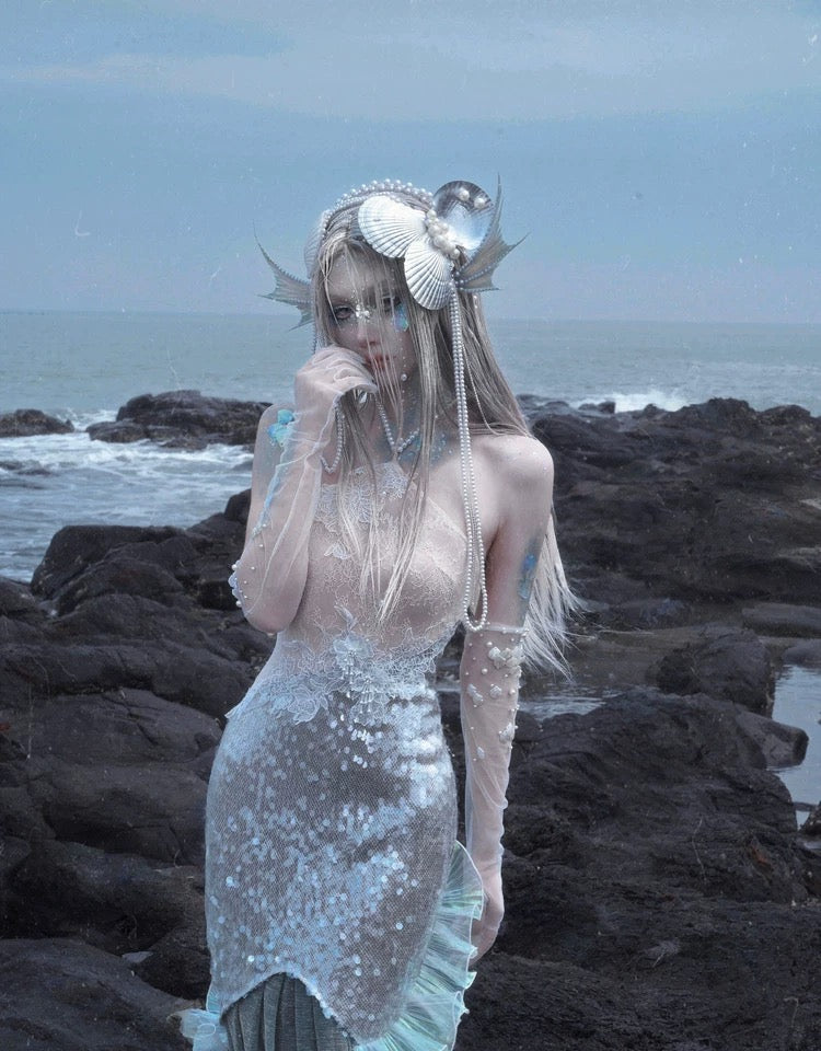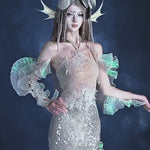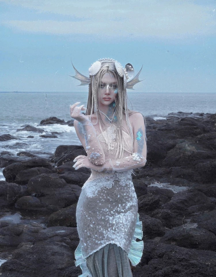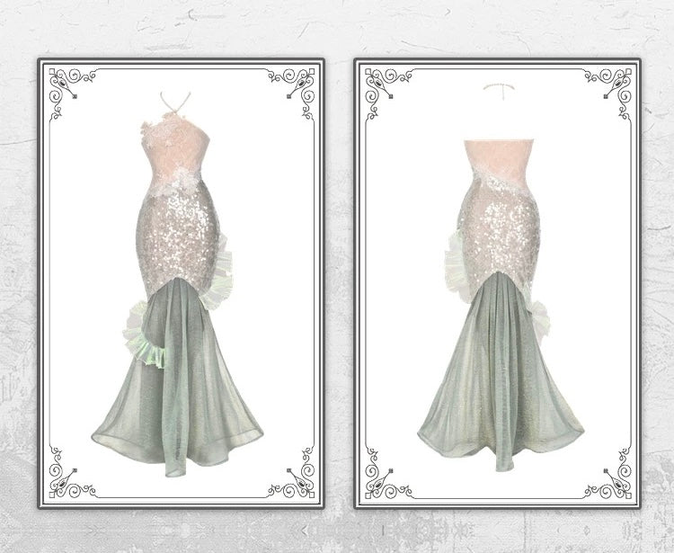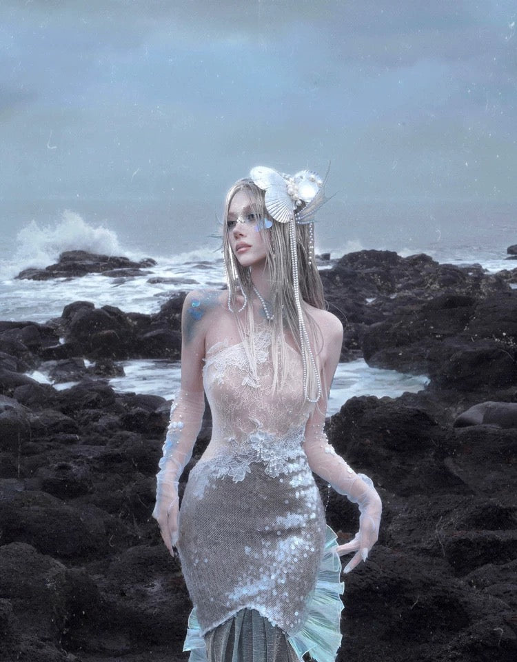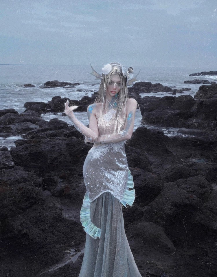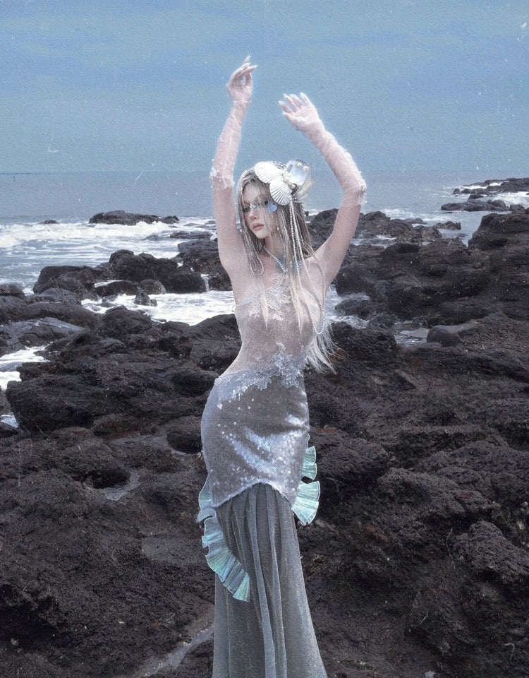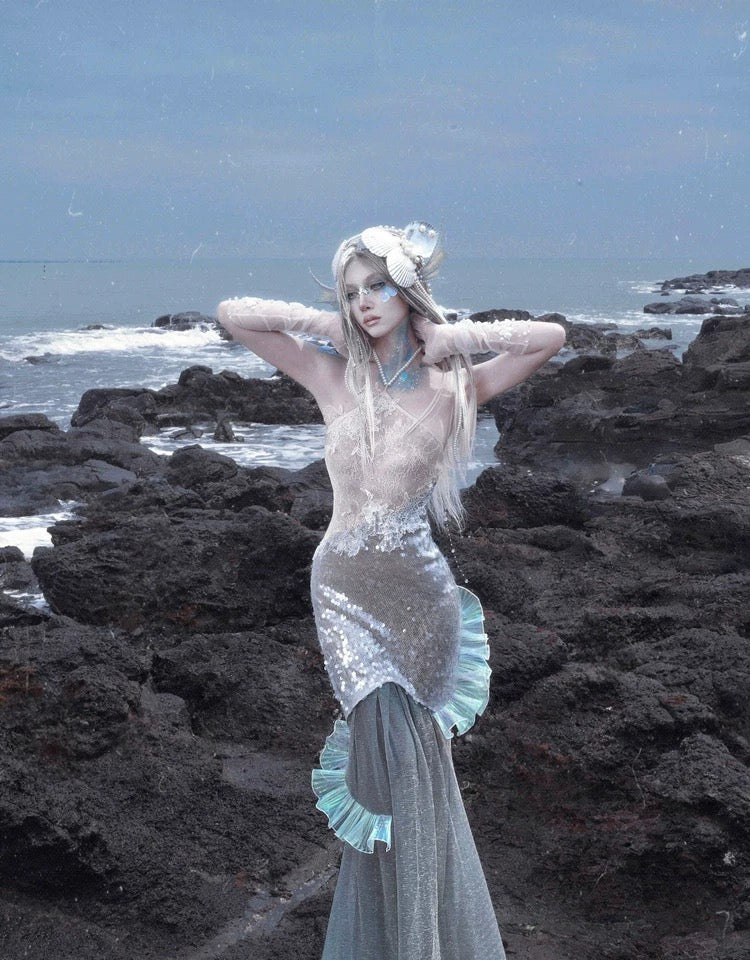 きらめくスパンコールメッシュが、海の波のように光を捉えます。裾の虹色に輝く生地はツートンカラーで輝き、歩くたびに魔法のような雰囲気を醸し出します。フリルのサイドパネルは、まるで人魚のヒレのように優雅に揺れ動きます。
