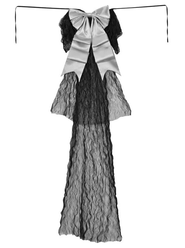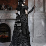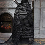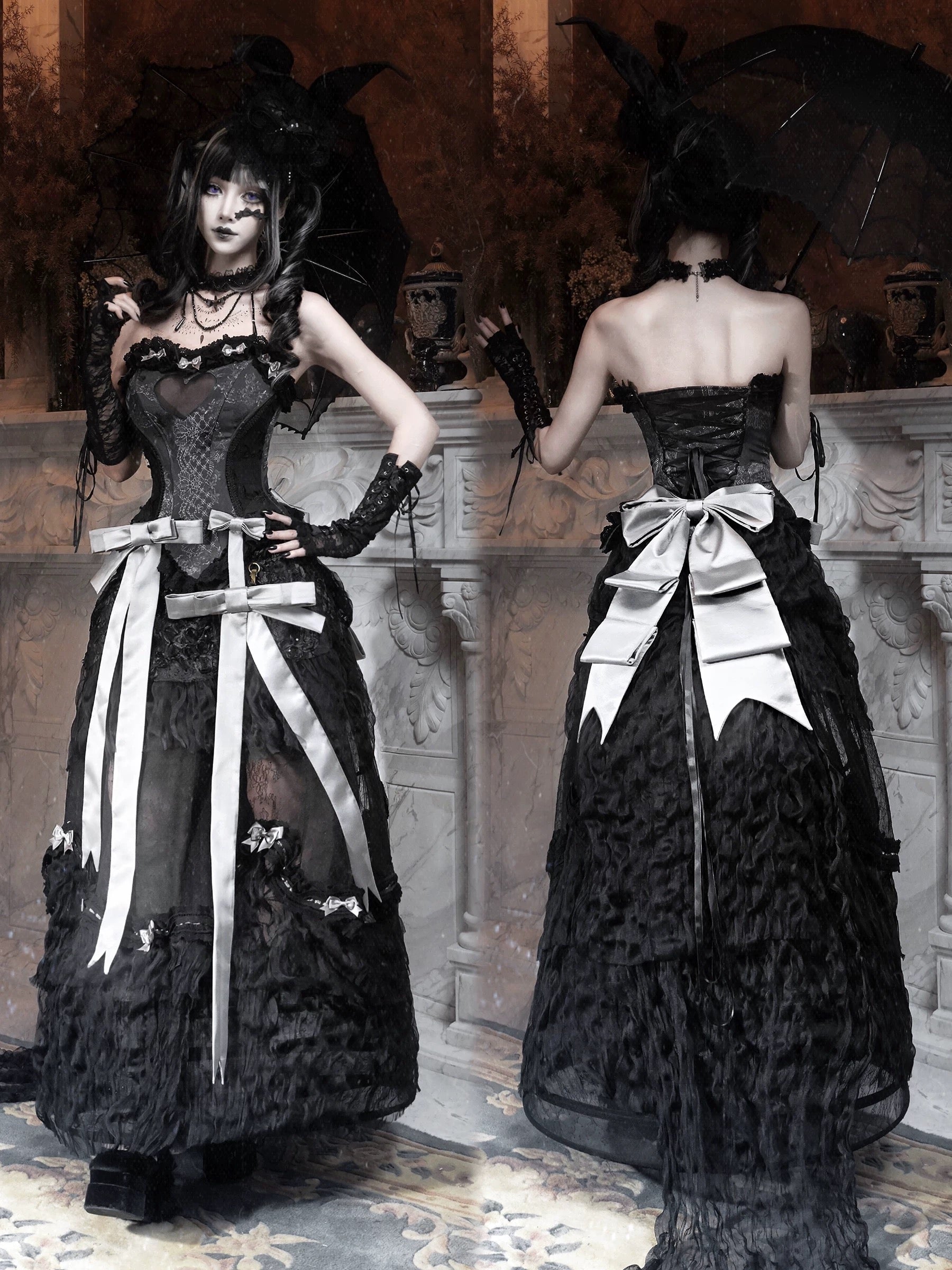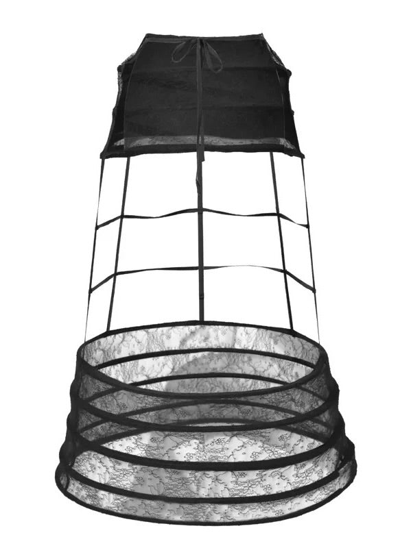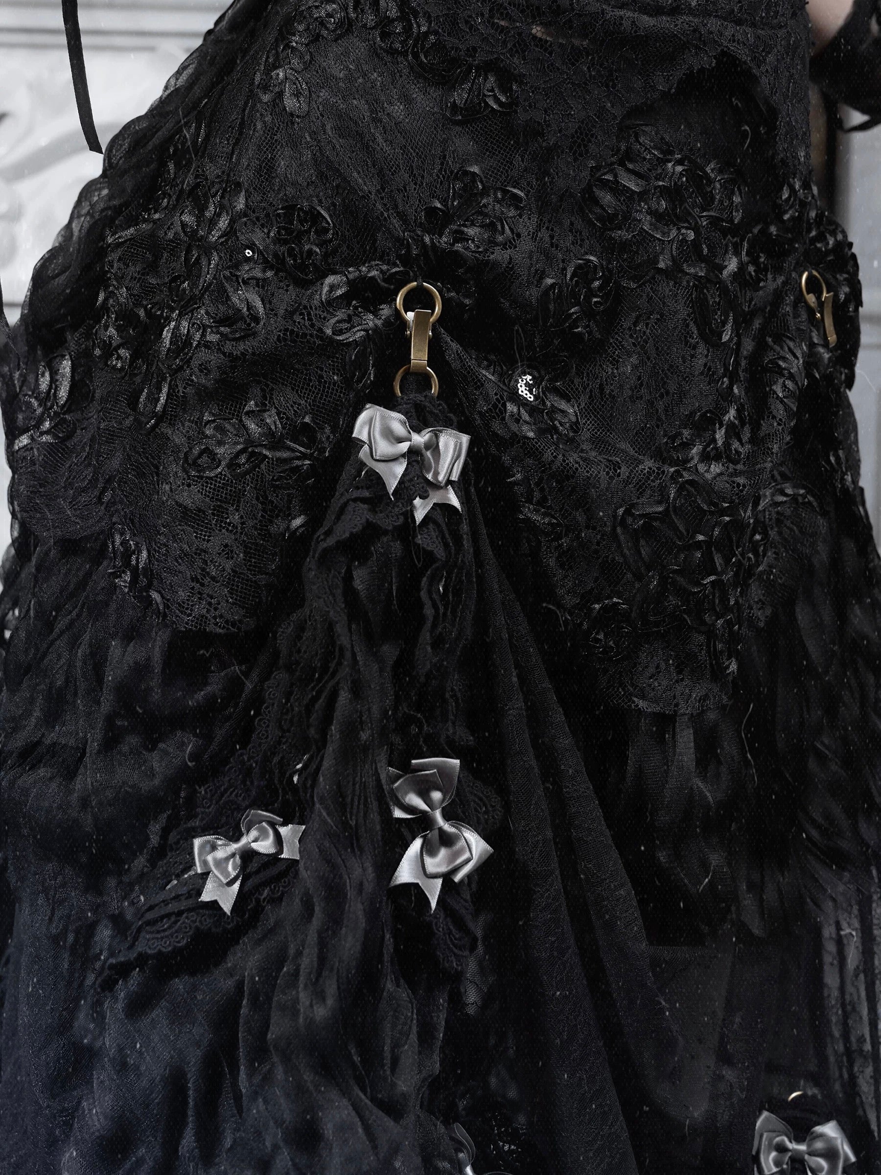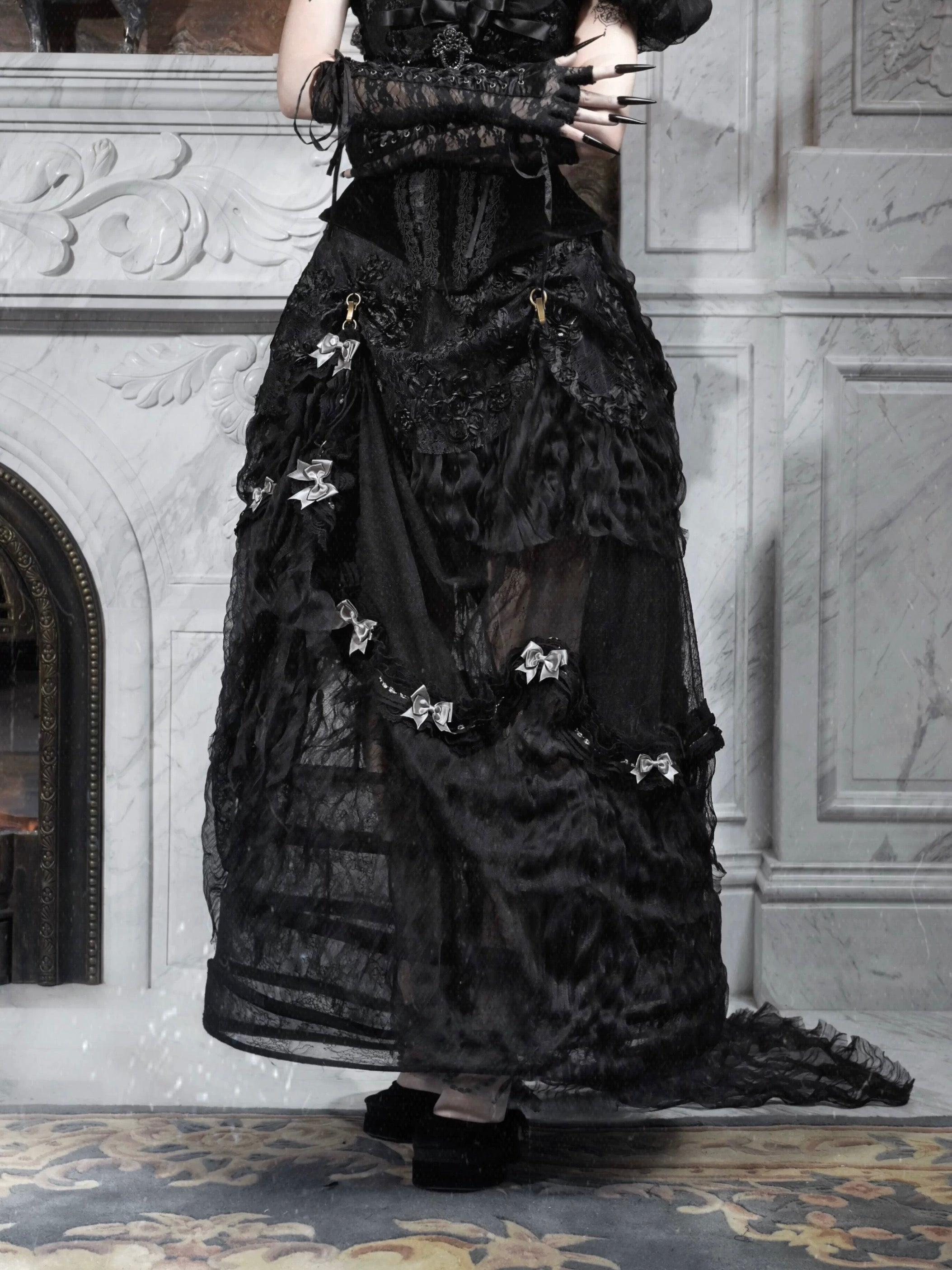The front is adorned with handcrafted metal hooks and vintage rose trims. The soft train in the back creates a flowing silhouette, finished with a giant detachable satin bow. Inside, a sculpted petticoat and crinoline cage keep the regal volume in place.