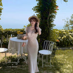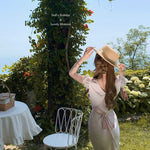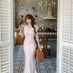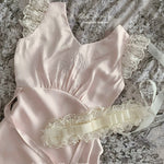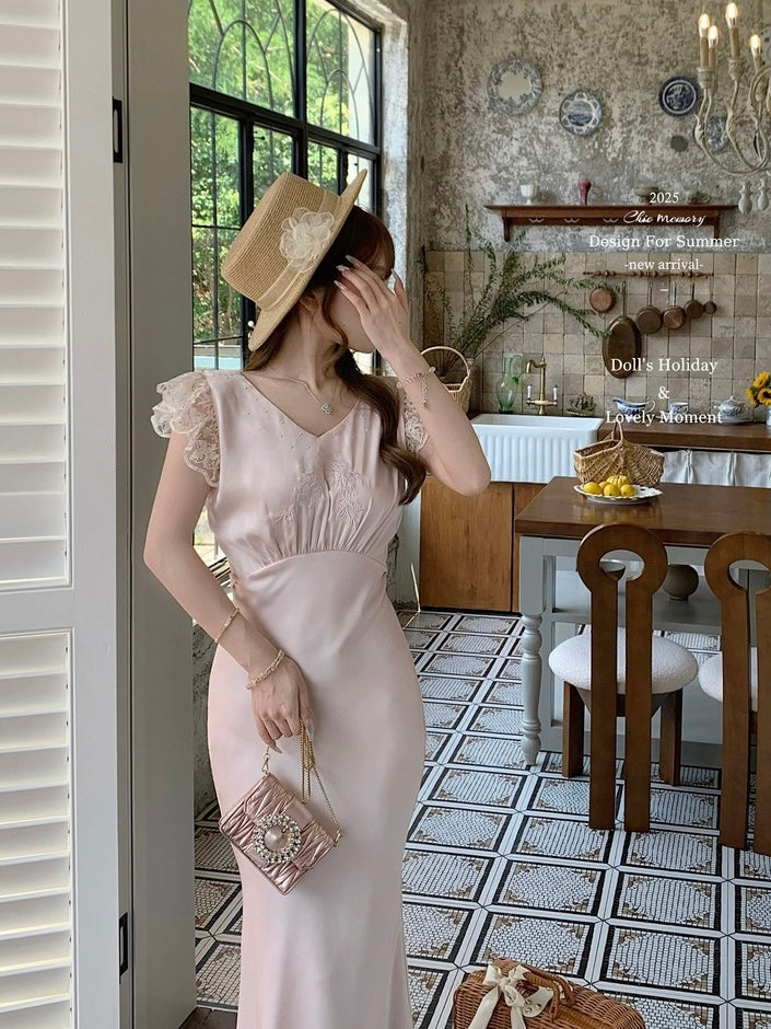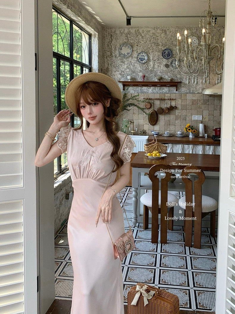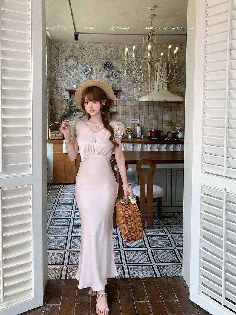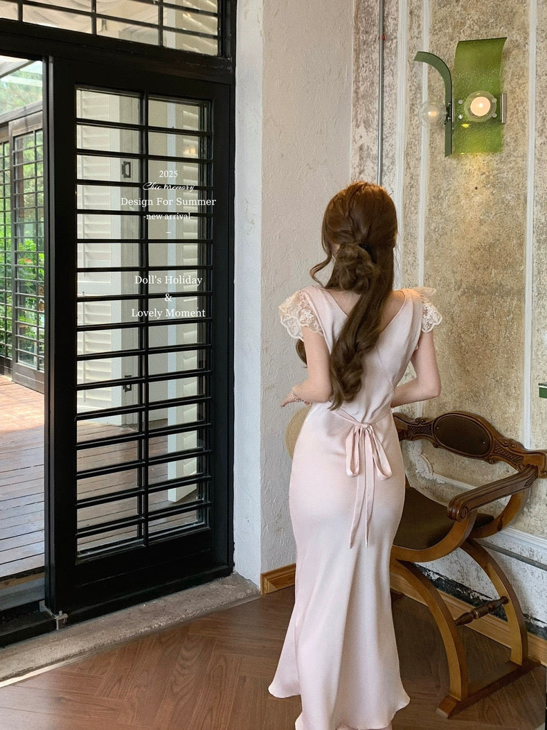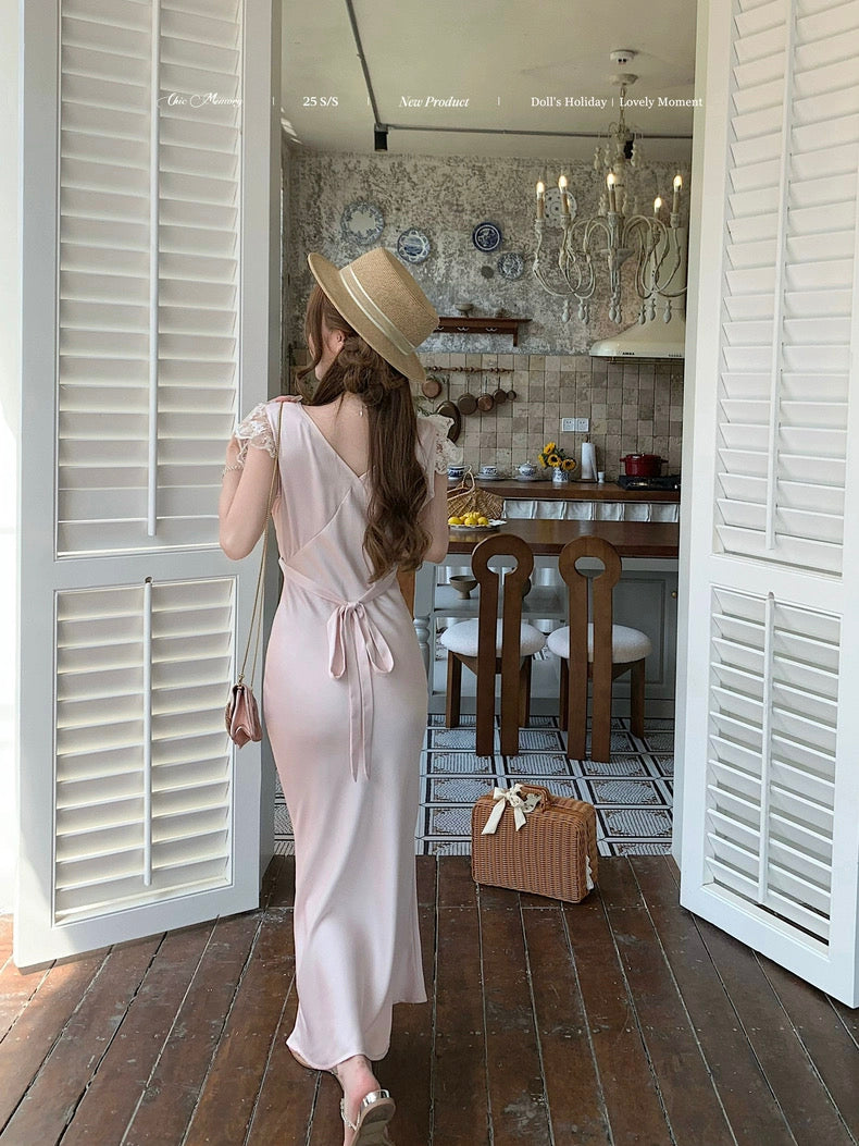 Graceful and poetic, Château Rosé evokes the timeless charm of an English garden lady — soft-spoken, warm, and effortlessly romantic. This full-length vintage-style dress is rendered in a rare powder blush rose tone (rose poudre), dyed with a custom shade to evoke the dreamlike hues of faded flower petals.