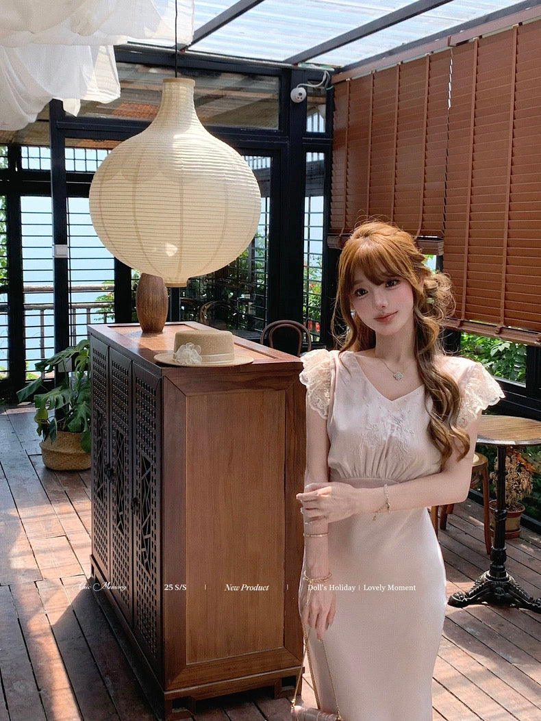 - Flutter sleeves finished in pale pink rose thread embroidery, reminiscent of falling petals on the shoulder