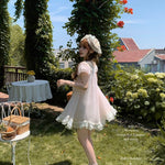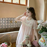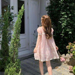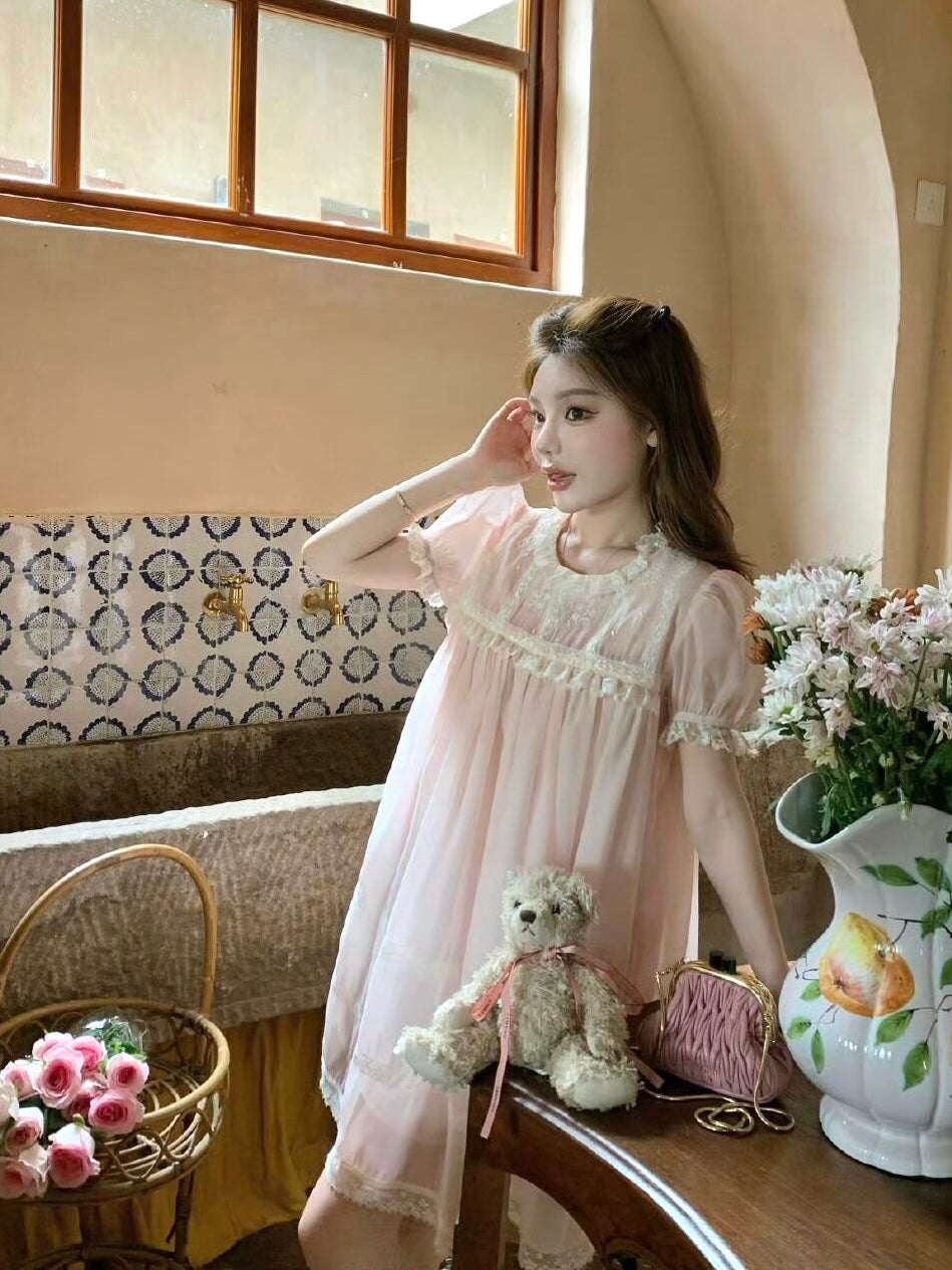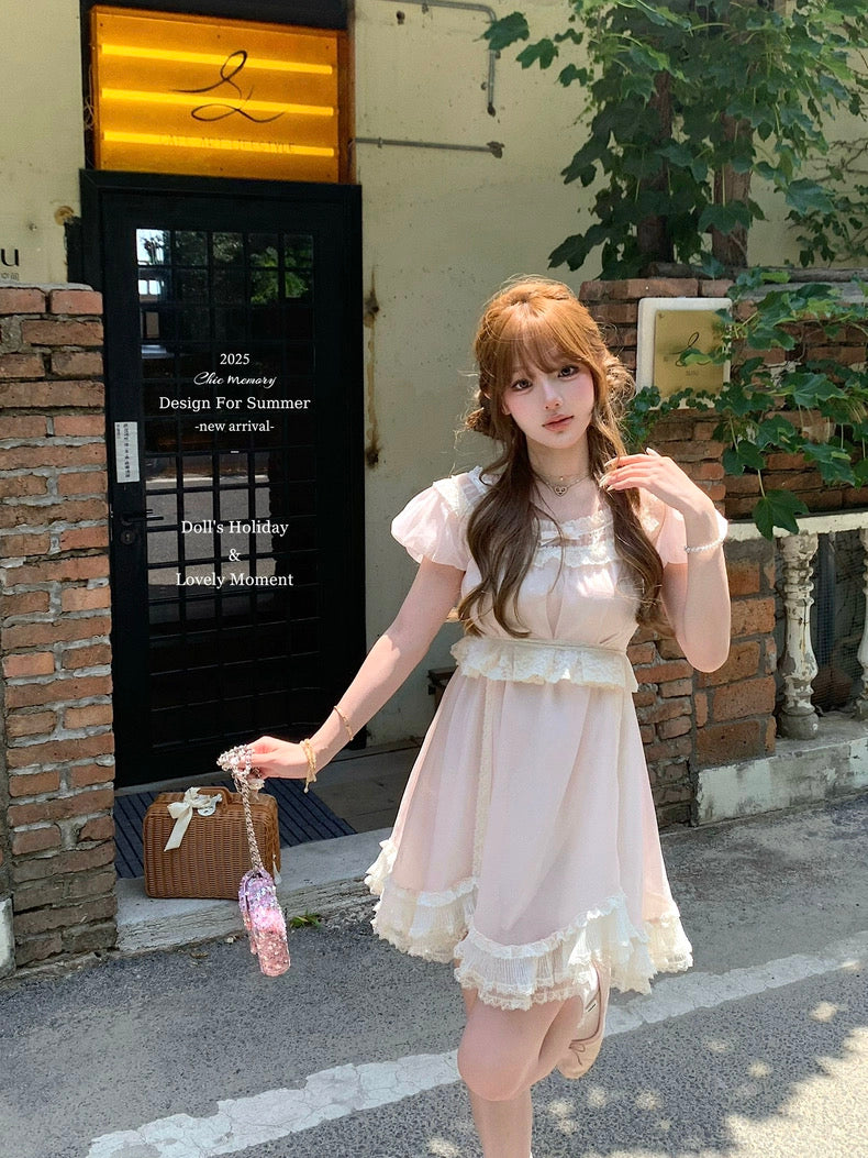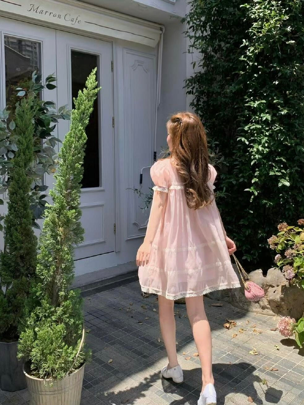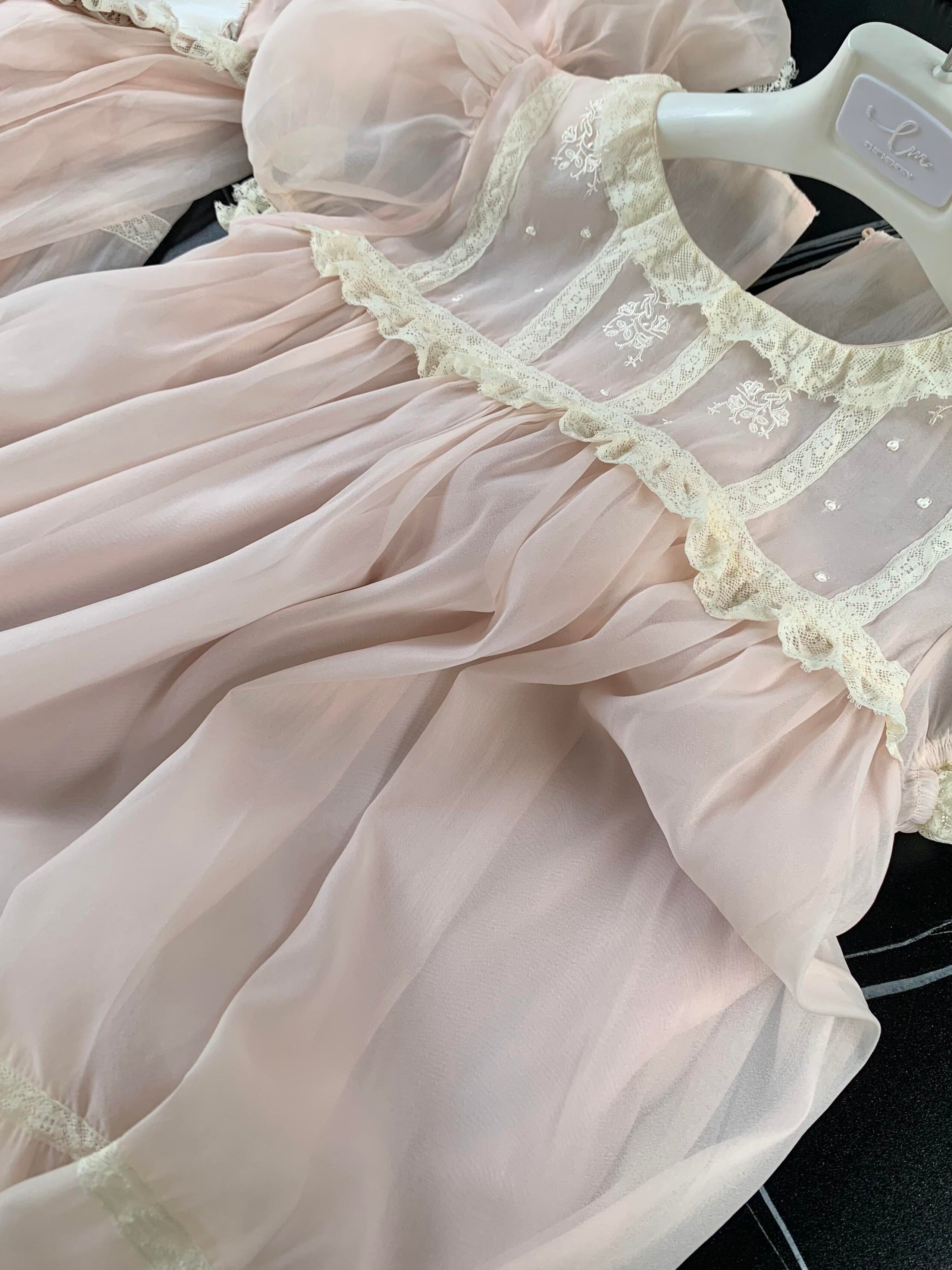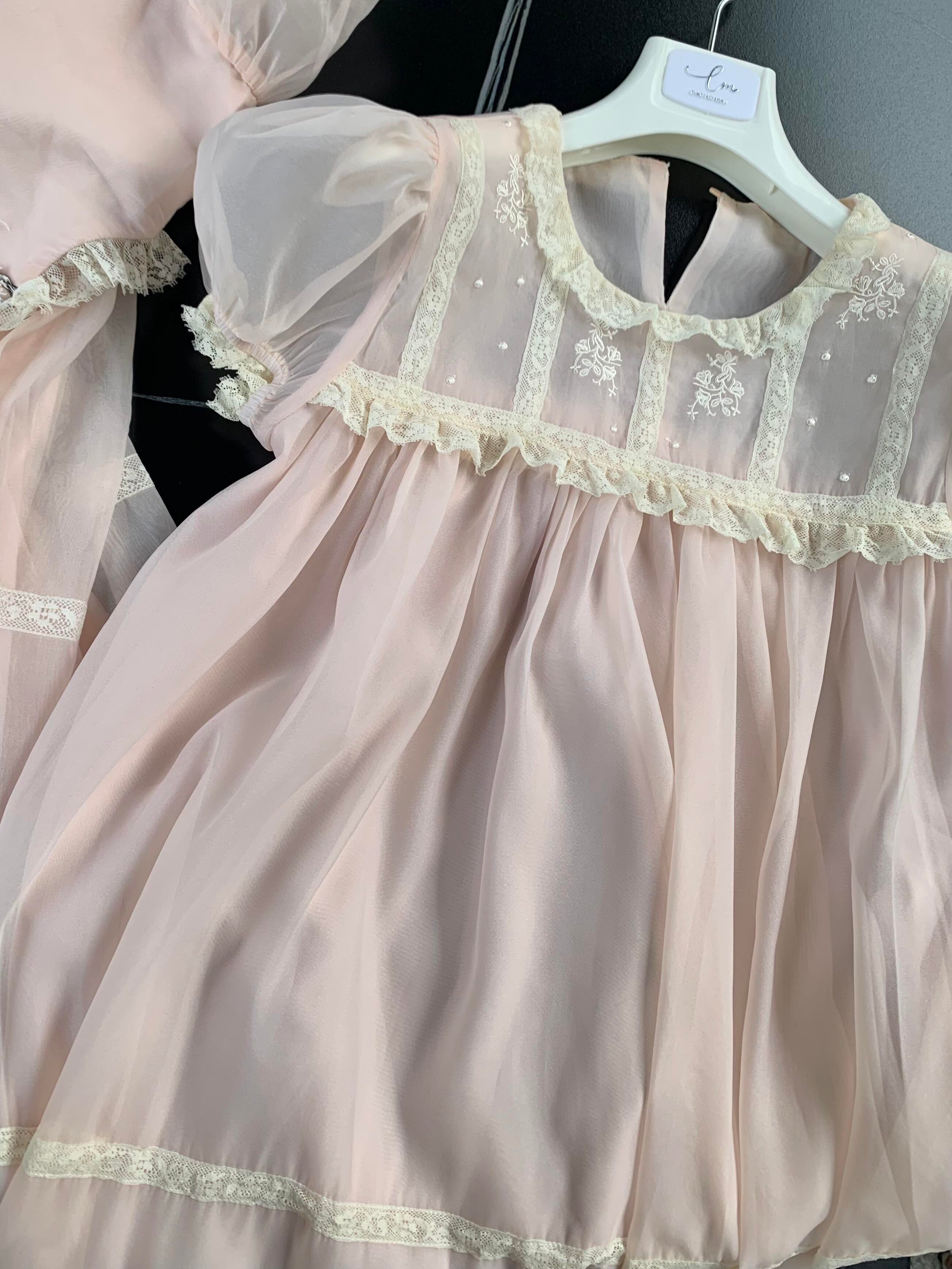 This handcrafted dress is made from fine organza layered over five types of lace, with every ruffle and hem delicately stitched by hand. The soft pink tone (rose pastel) glows subtly under natural light, making it a dreamy choice for garden picnics, vintage cafés, or your favorite coquette core moment.