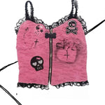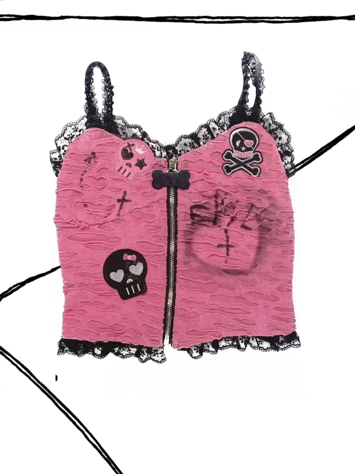 Featuring crushed pink cotton, punk graffiti, skull patches, and a dogtag zipper.