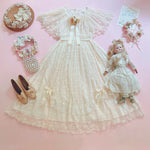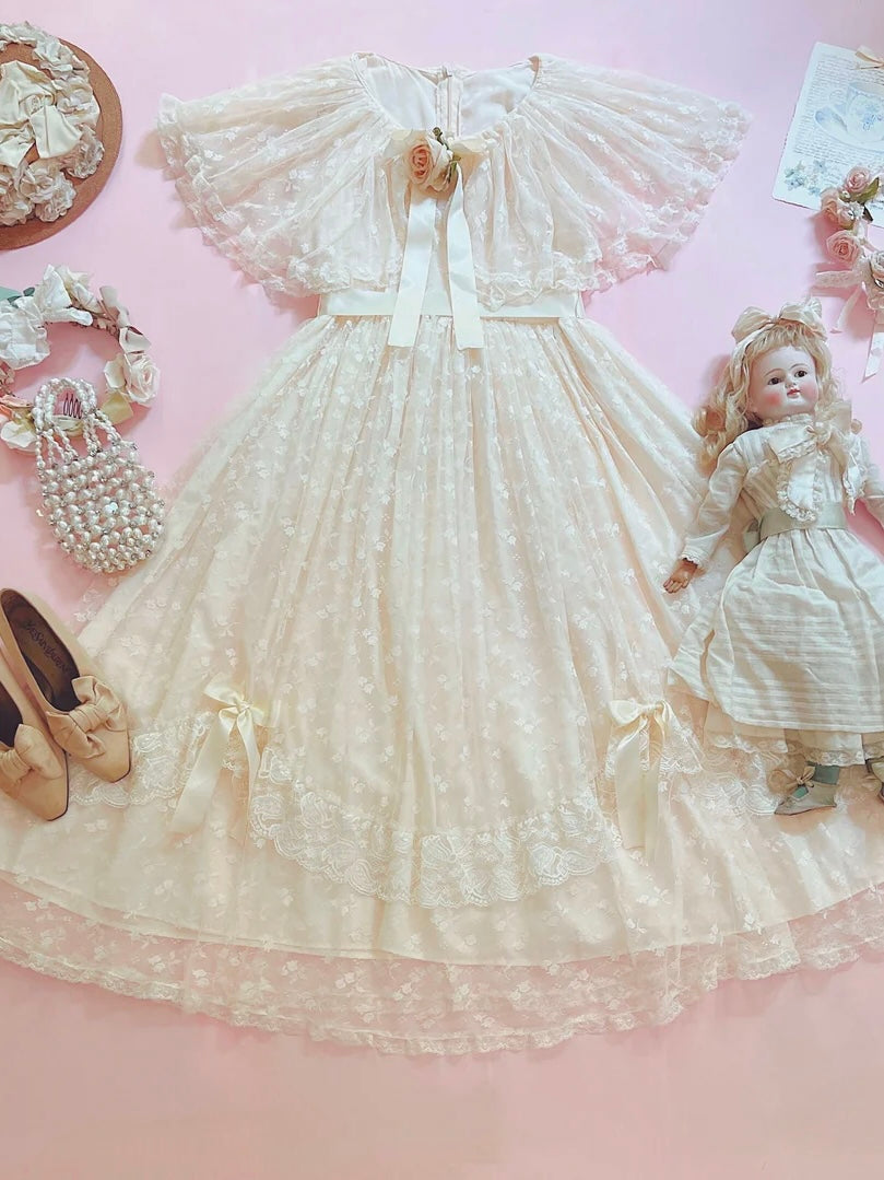 柔らかなアイボリーの色合い、重ねたチュールスカート、そしてチャーミングなリボンのアクセントが特徴的なこのドレスは、春に咲き誇るユリのロマンチックなエッセンスを捉えています。ケープレットスタイルのオーバーレイがヴィクトリアンな雰囲気を添え、時代を超越したフェミニンなルックを演出します。