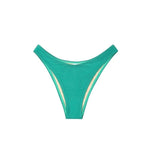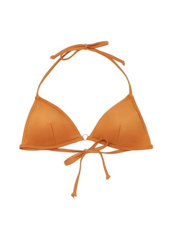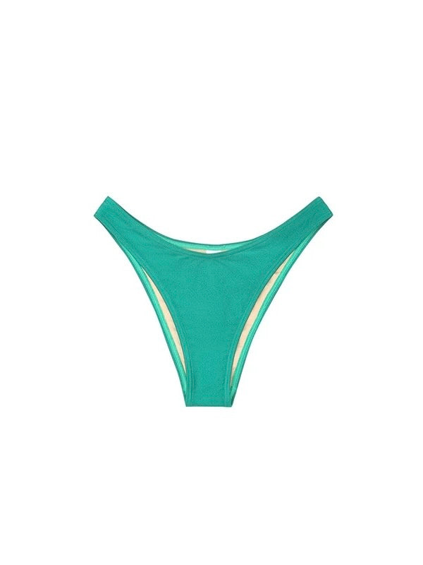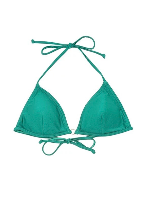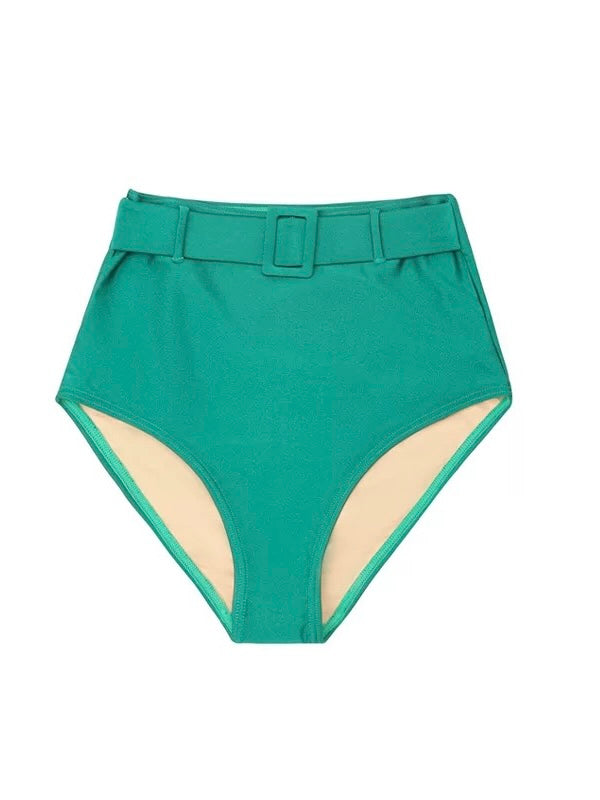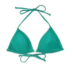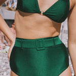 Indulge in elegance with our Italian-imported Carvico Lycra bikini, featuring a pearlescent finish. The classic triangle cup top is enhanced with a halter neck tie for a gathered effect and customizable fit. The high-waisted bottoms, adorned with a belt detail, offer a flattering high-cut design. Complete with padded cups and adjustable straps, this set provides both comfort and a stylish silhouette.