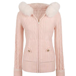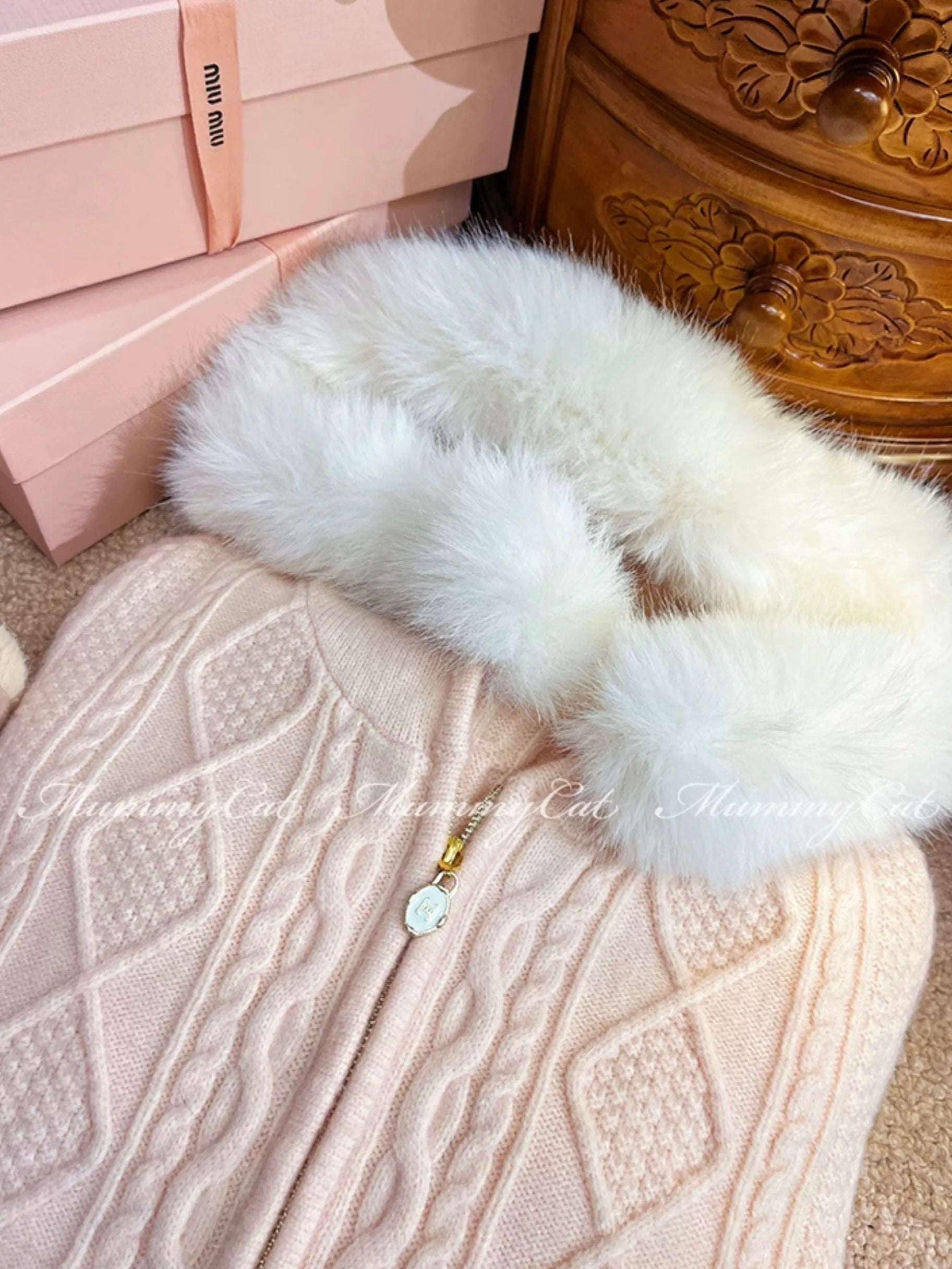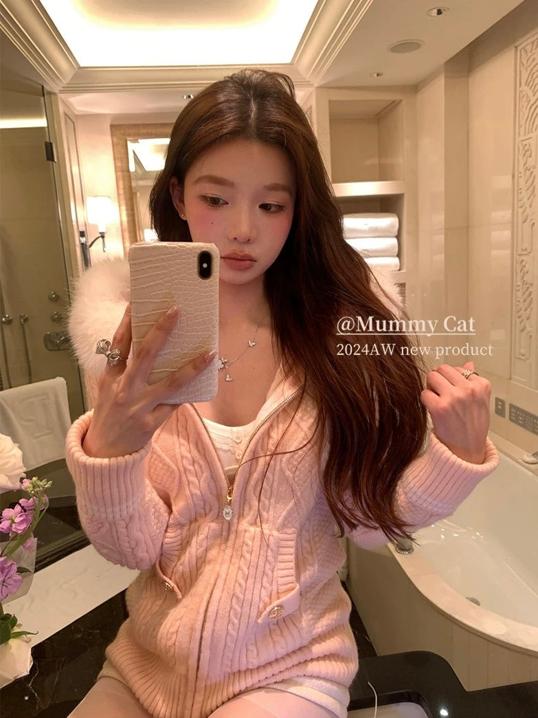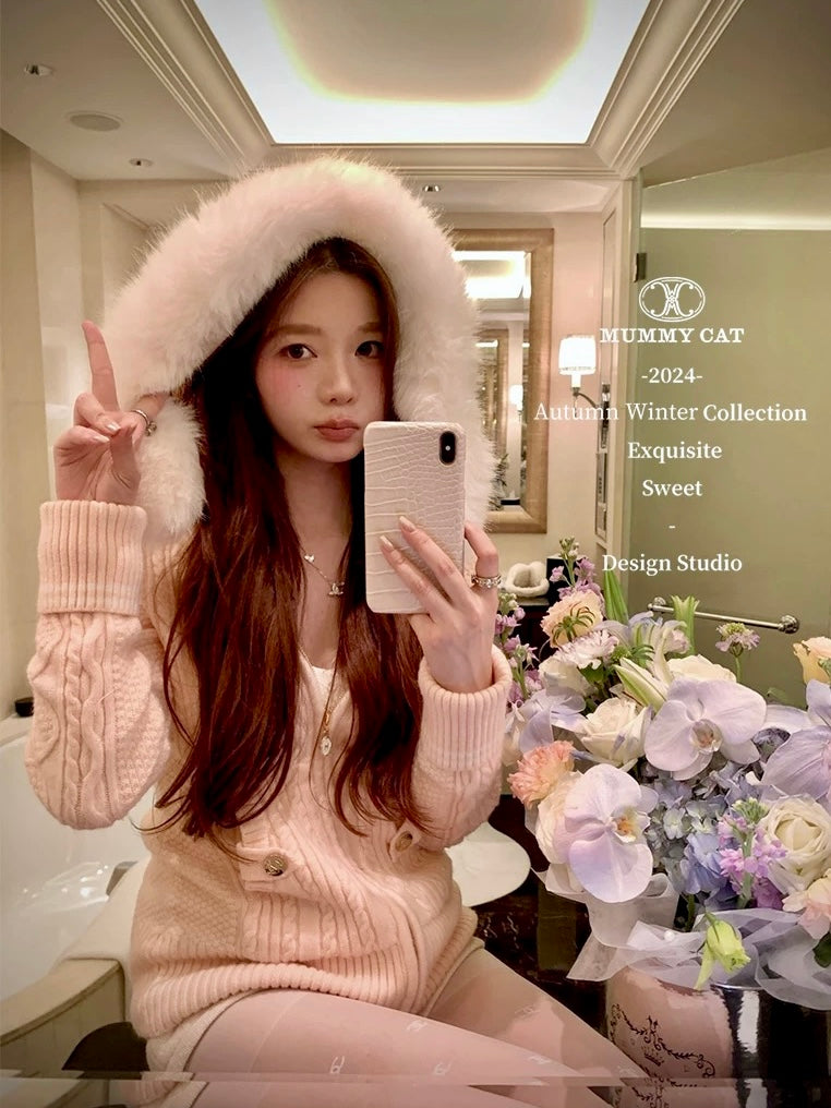 This soft pink knit hoodie is delicately detailed with diamond and braid patterns, while the hood is trimmed with fluffy faux fur, adding a soft snow-kissed elegance. Designed with a slim, slim fit, golden button accents, and a plush knit texture, it’s perfect for layering at festive gatherings or cozy winter outings.