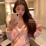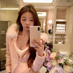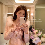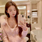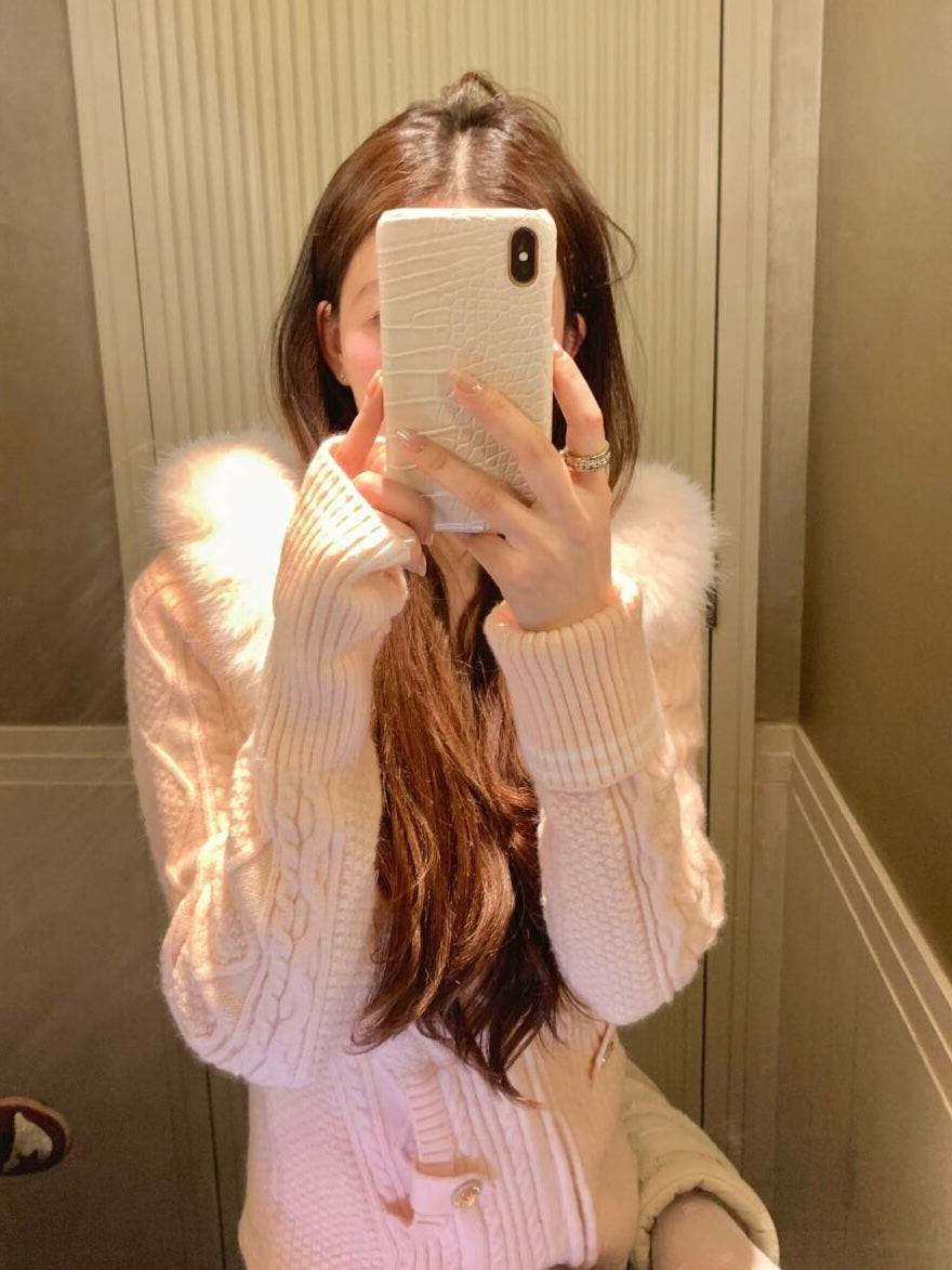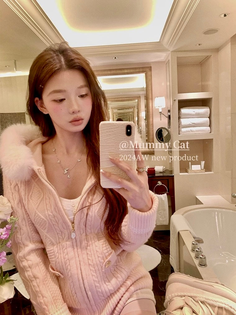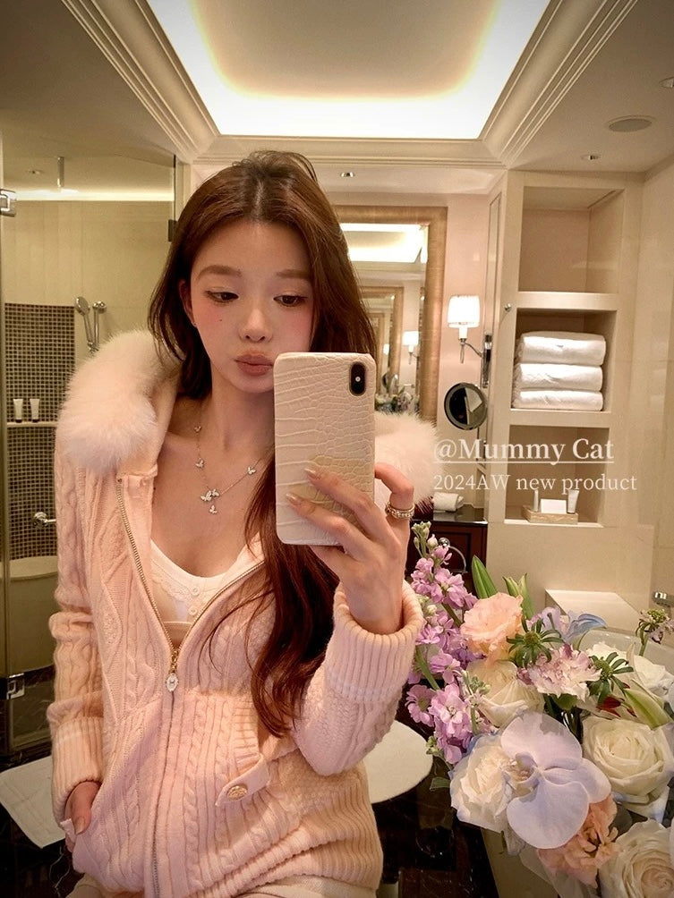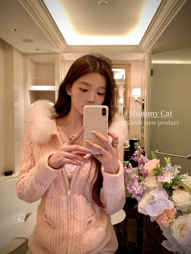 This soft pink knit hoodie is delicately detailed with diamond and braid patterns, while the hood is trimmed with fluffy faux fur, adding a soft snow-kissed elegance. Designed with a slim, slim fit, golden button accents, and a plush knit texture, it’s perfect for layering at festive gatherings or cozy winter outings.