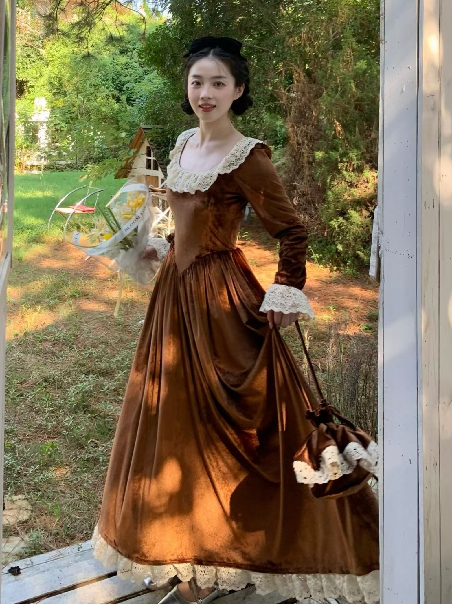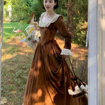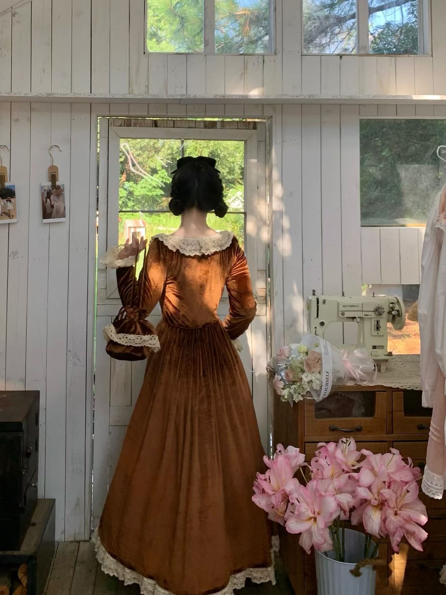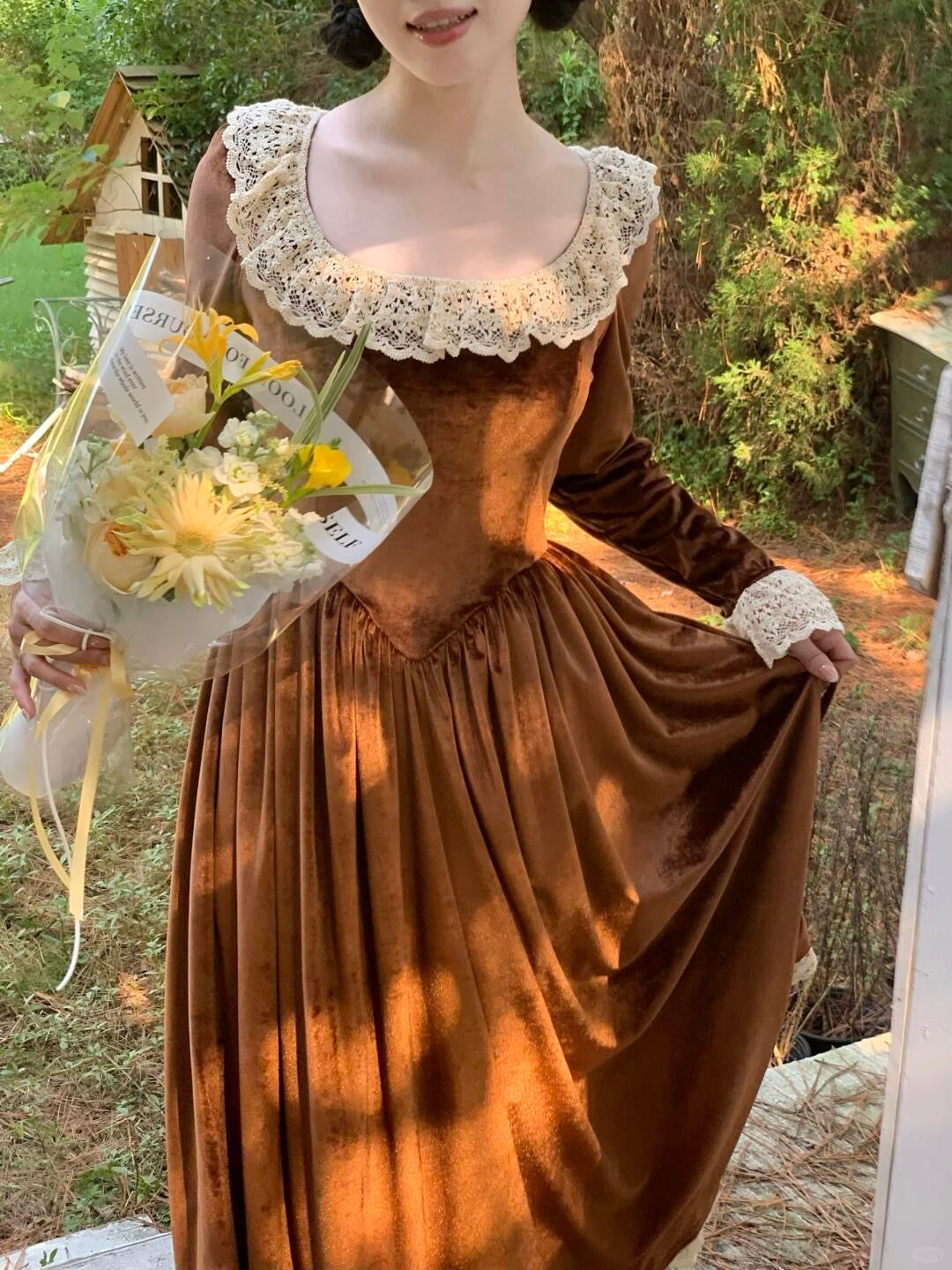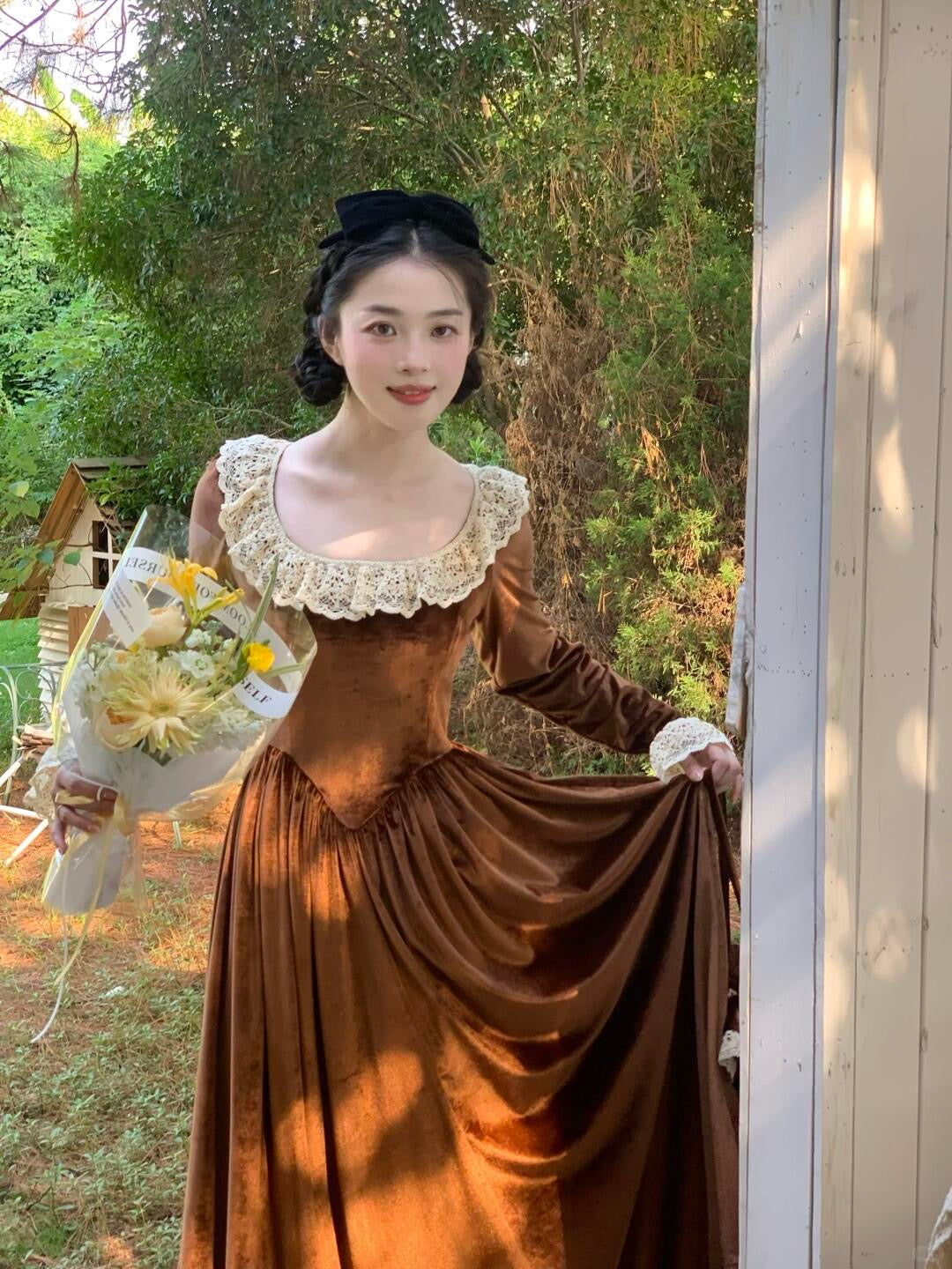 The Autumn Swan Velvet Gown captures the charm of a forgotten French romance. Made from brown velvet with a soft golden sheen, it drapes gracefully with every movement. A square neckline trimmed in ivory lace and matching lace cuffs add a touch of vintage nobility, while the gathered waist and flowing skirt recall the elegance of centuries past.