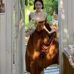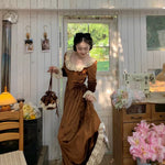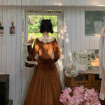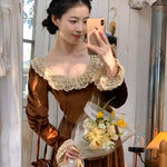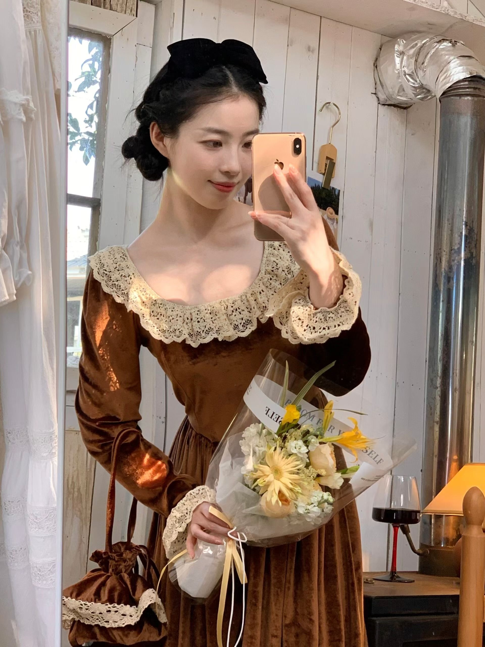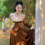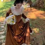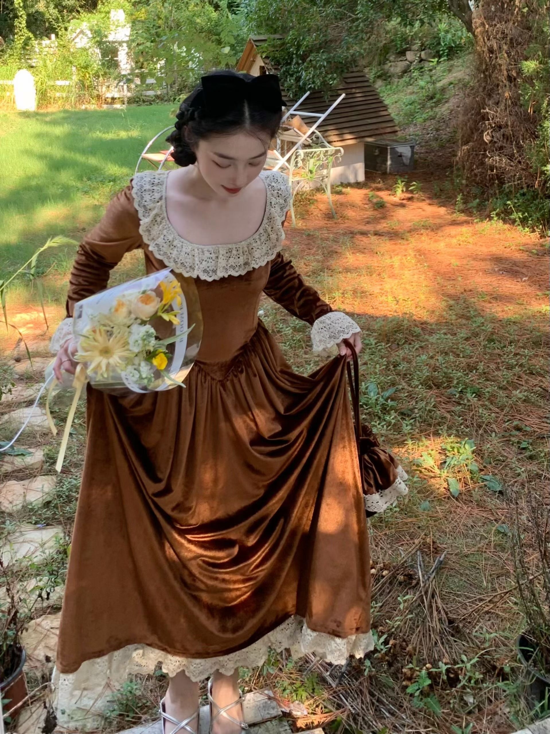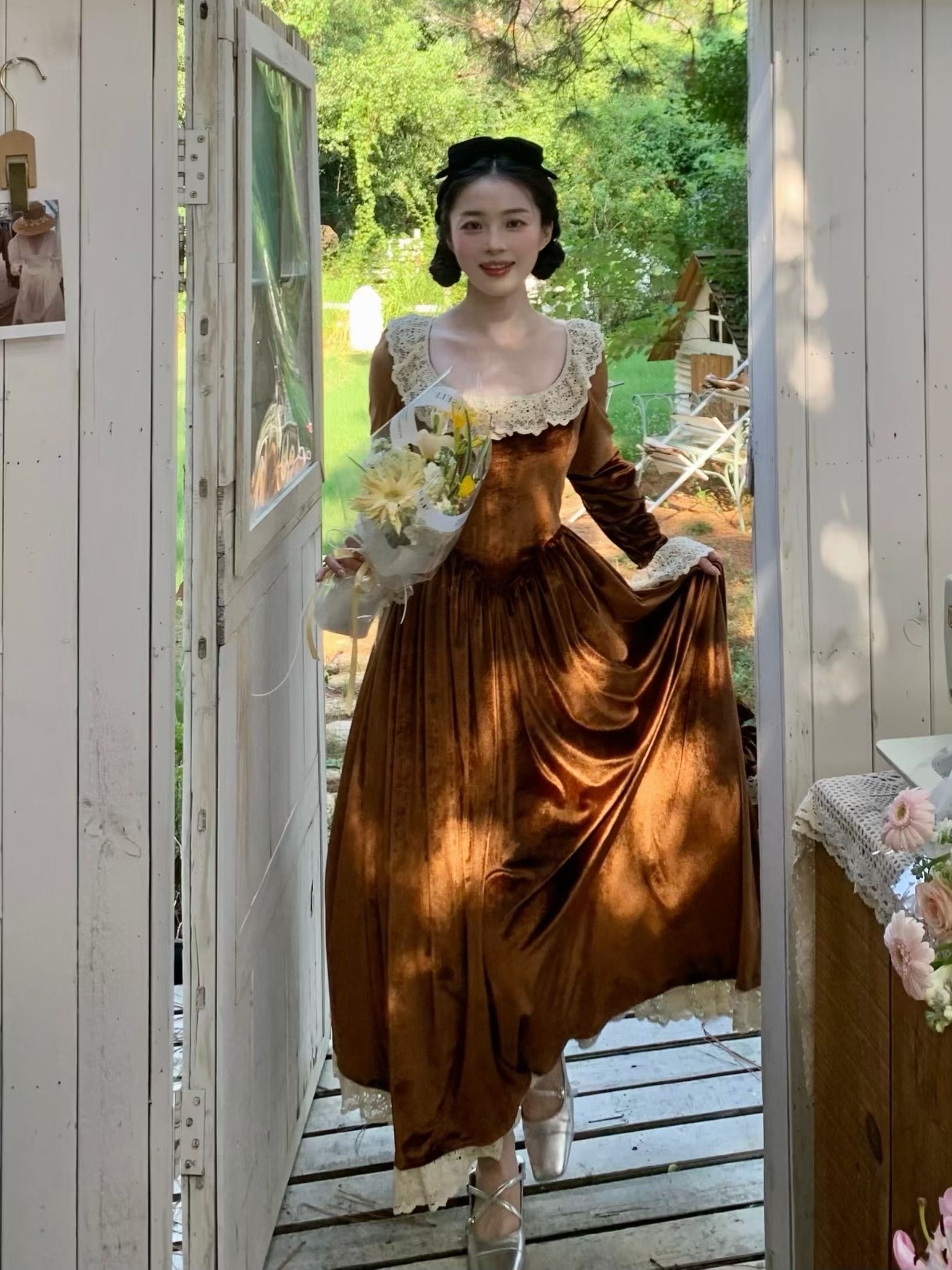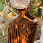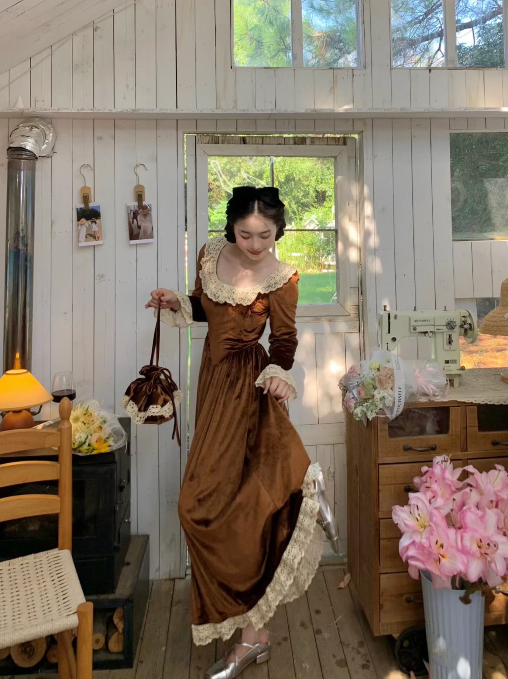 The Autumn Swan Velvet Gown captures the charm of a forgotten French romance. Made from brown velvet with a soft golden sheen, it drapes gracefully with every movement. A square neckline trimmed in ivory lace and matching lace cuffs add a touch of vintage nobility, while the gathered waist and flowing skirt recall the elegance of centuries past.