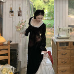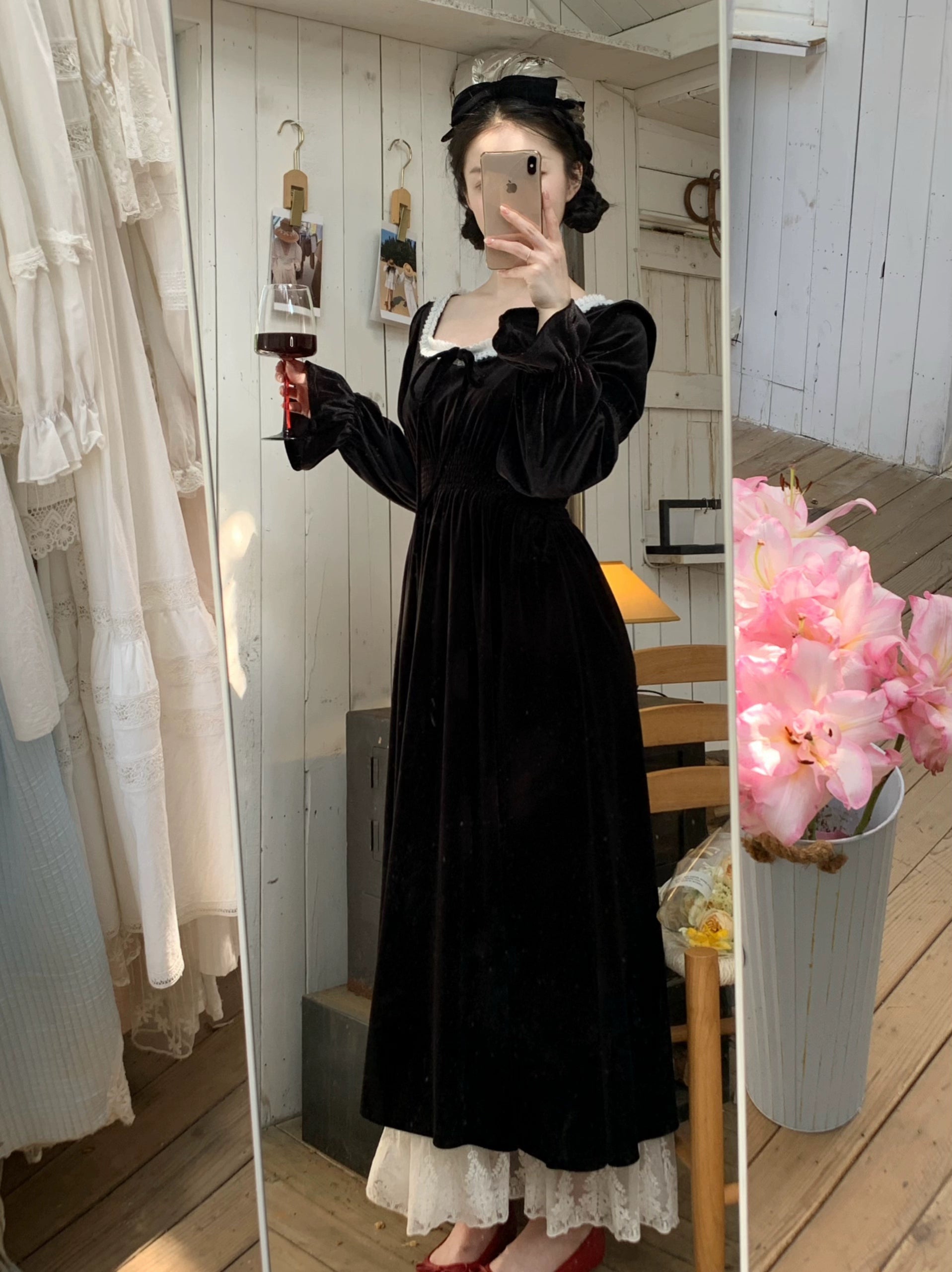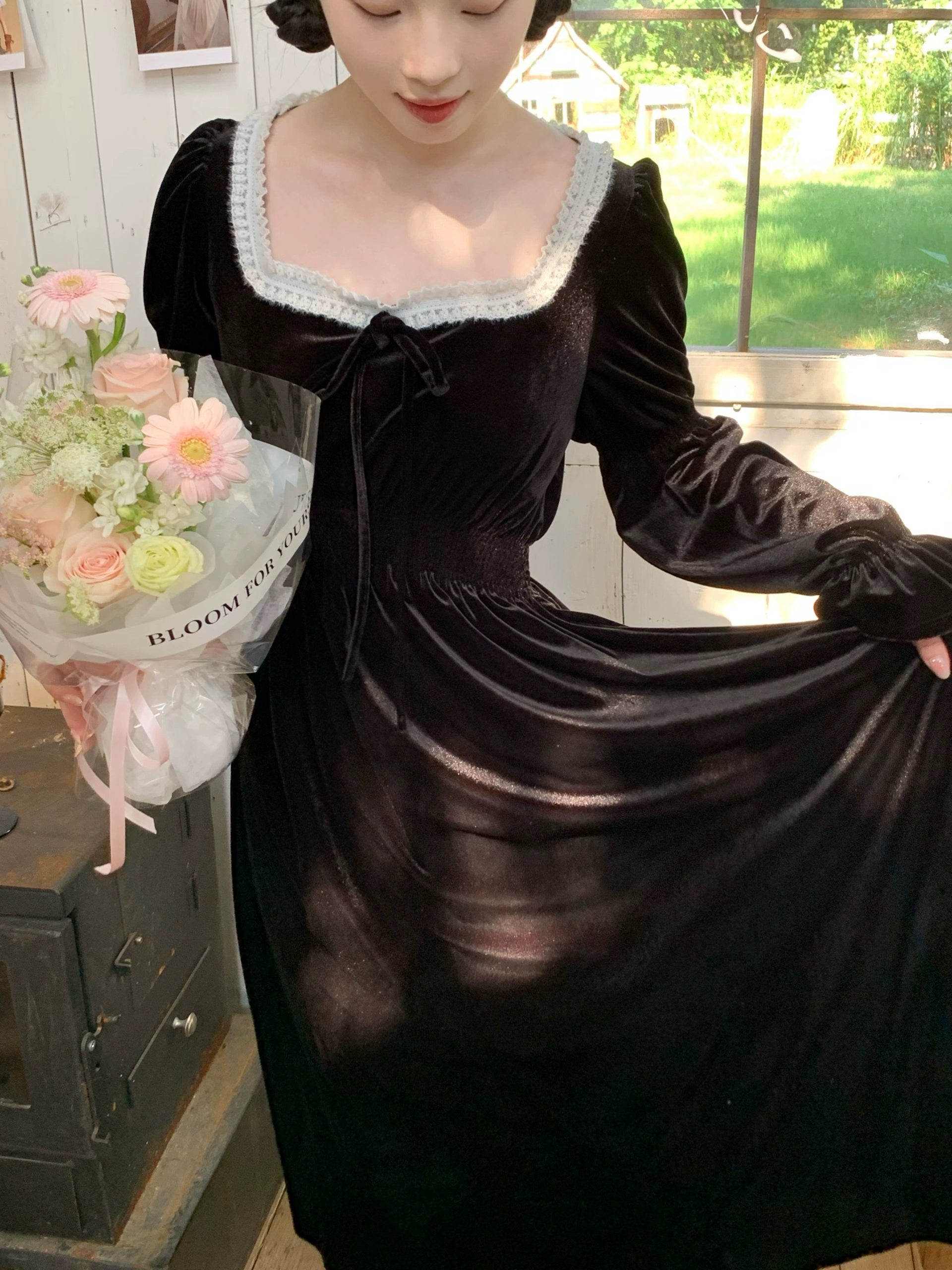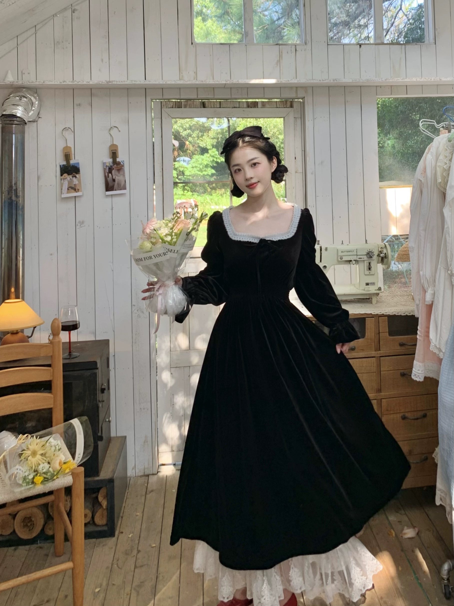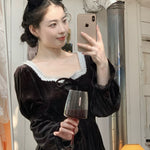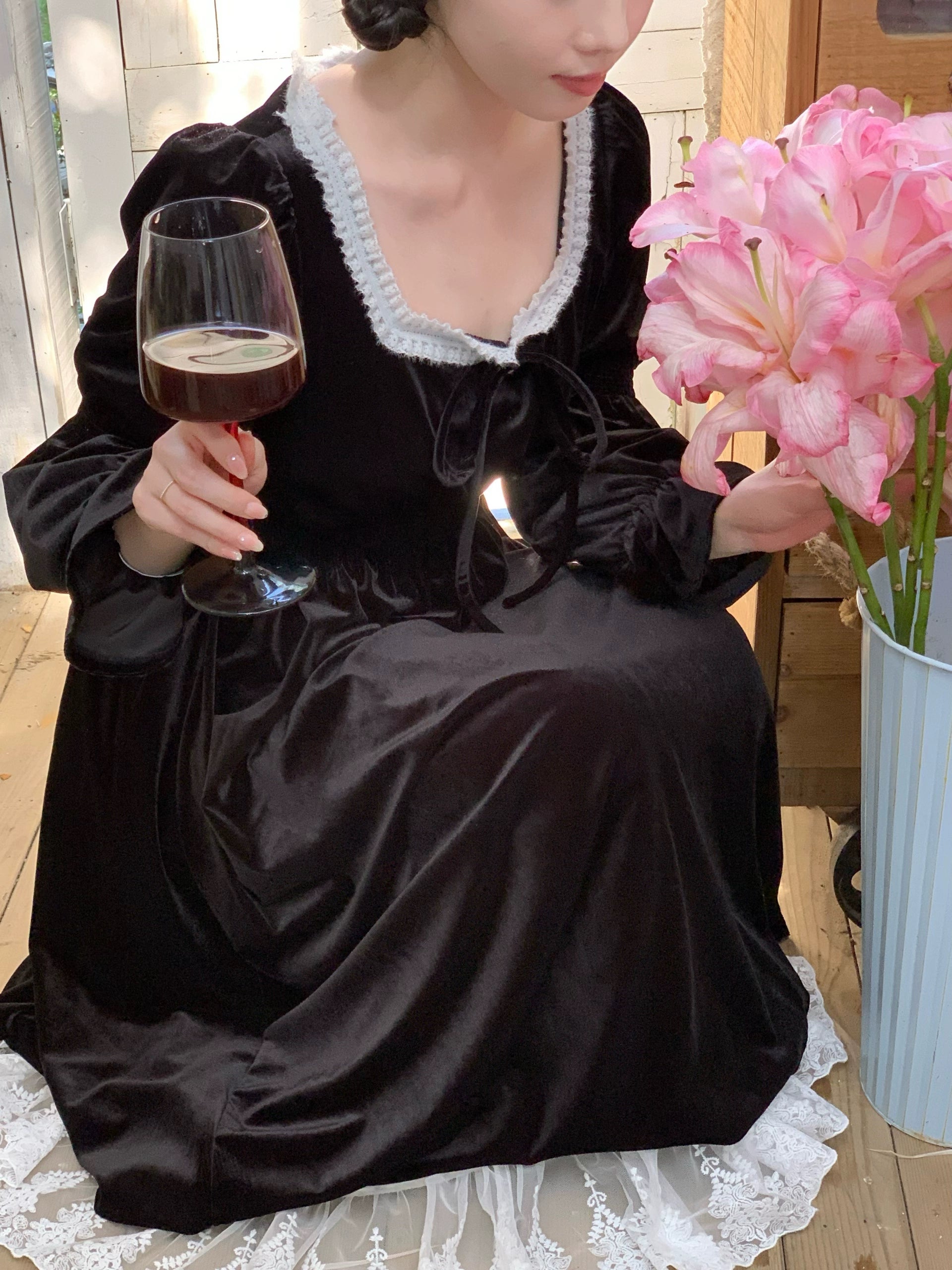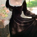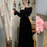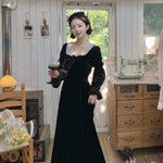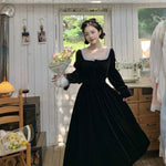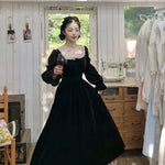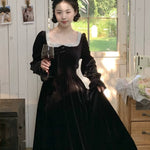 A timeless ode to romantic elegance, the Midnight Swan Velvet Gown drapes in rich black velvet, soft to the touch and endlessly graceful. The square neckline is framed with delicate lace, while the long bishop sleeves and flowing skirt create a silhouette both noble and ethereal.