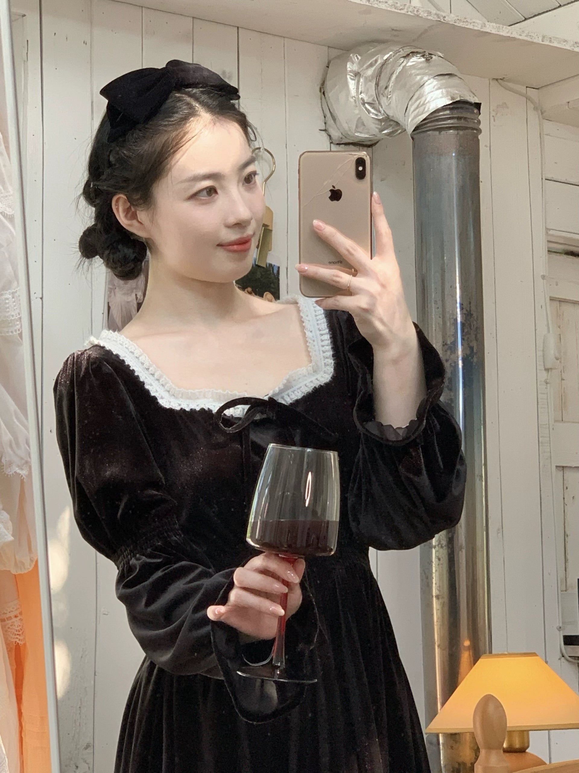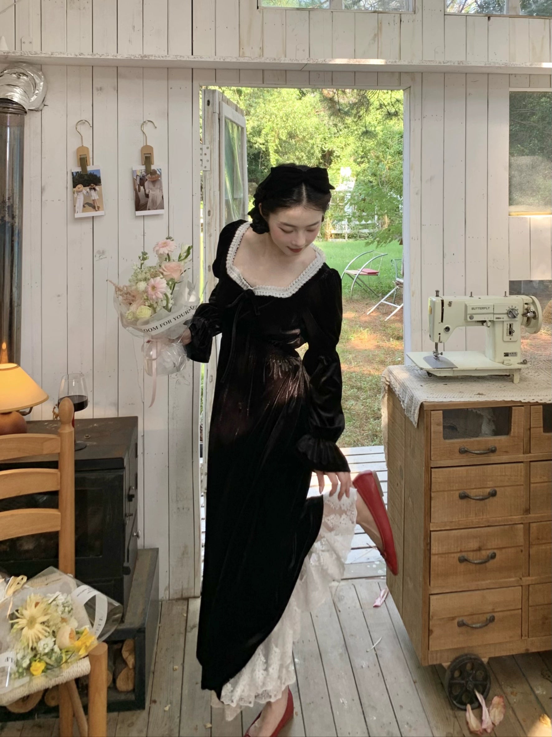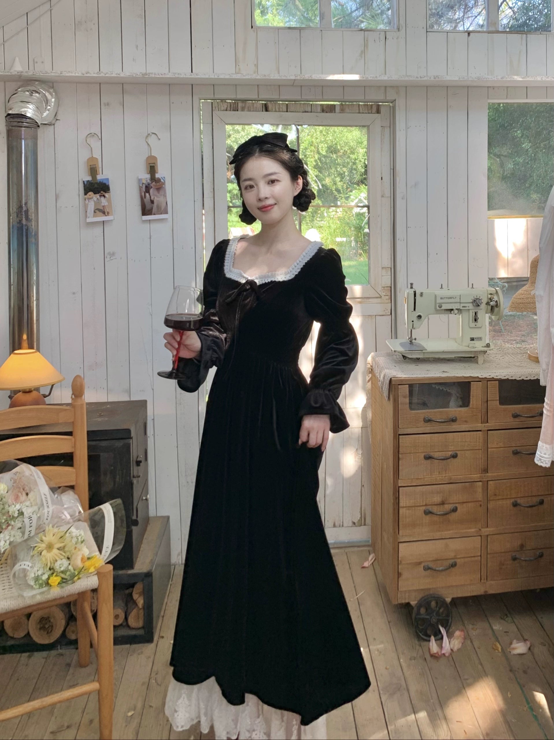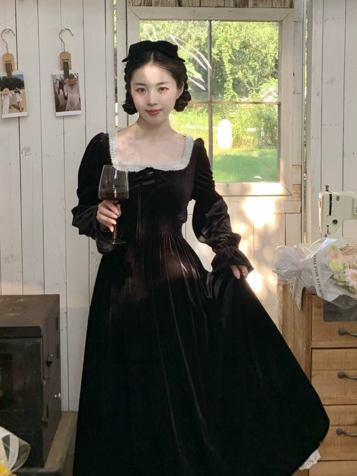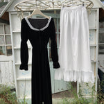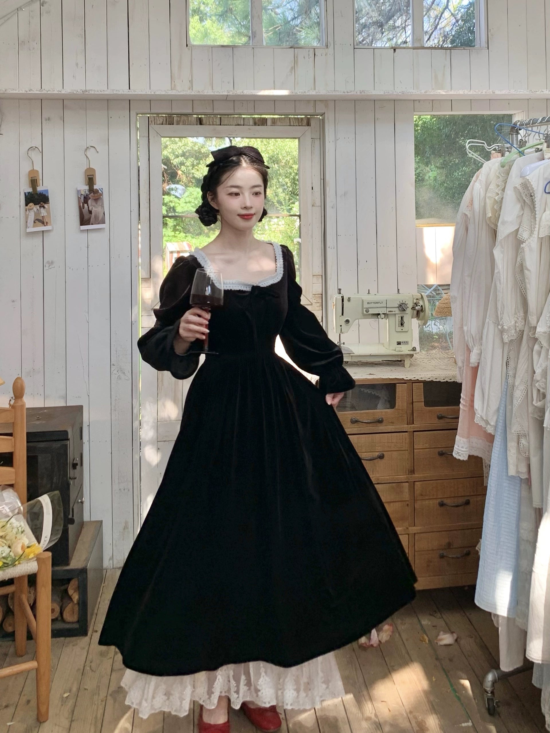 A timeless ode to romantic elegance, the Midnight Swan Velvet Gown drapes in rich black velvet, soft to the touch and endlessly graceful. The square neckline is framed with delicate lace, while the long bishop sleeves and flowing skirt create a silhouette both noble and ethereal.