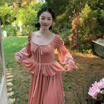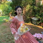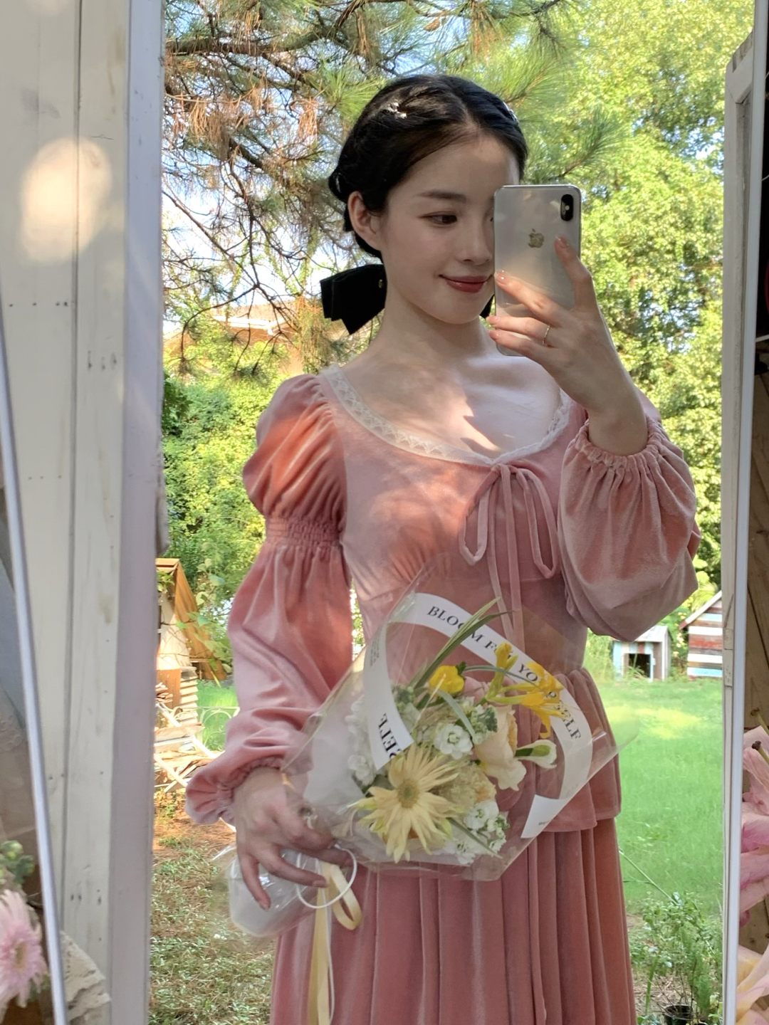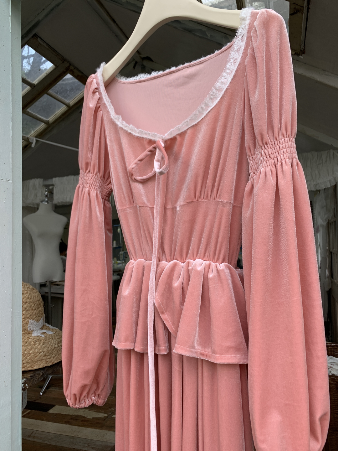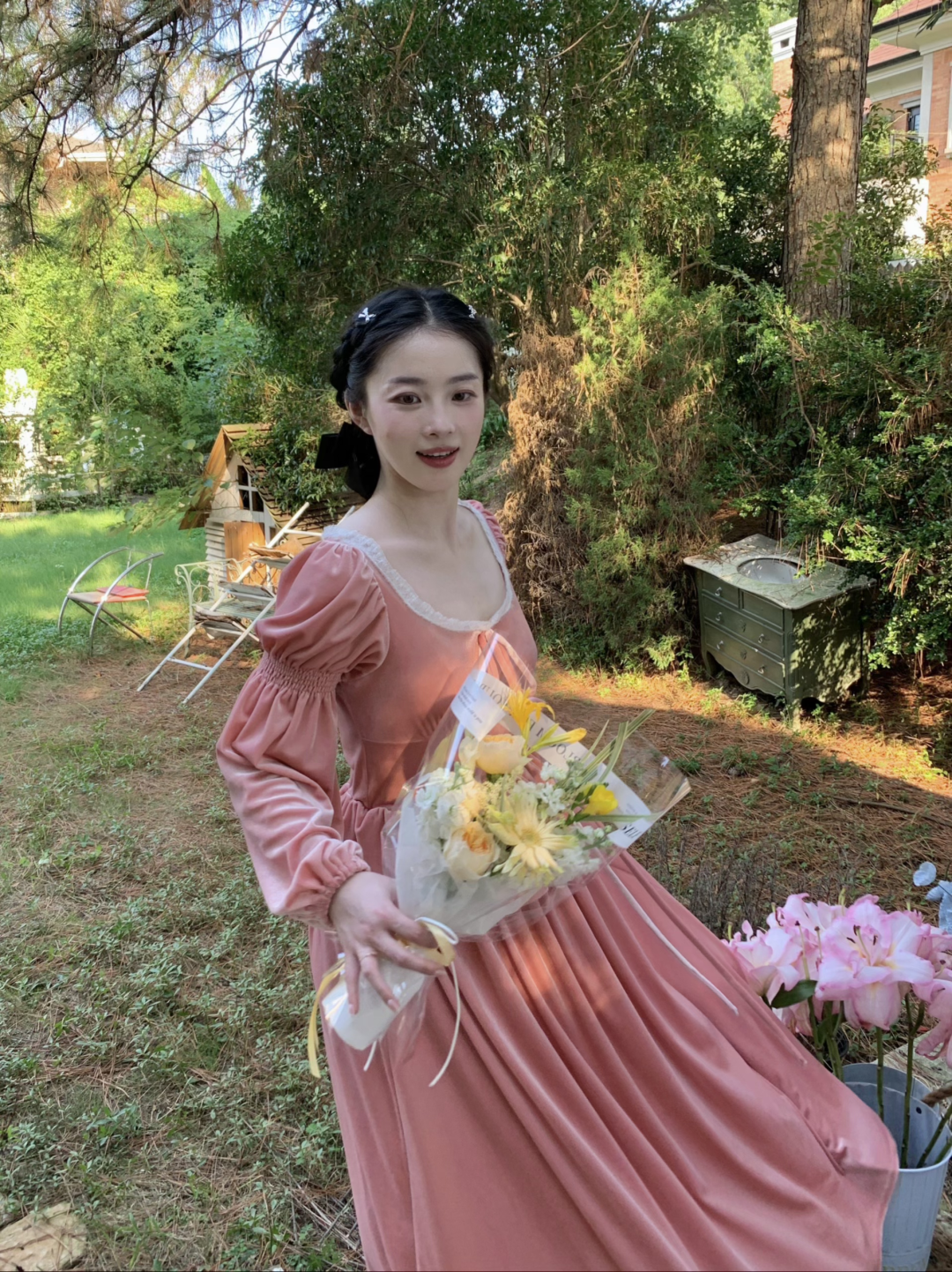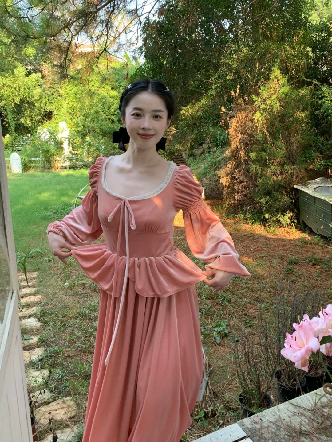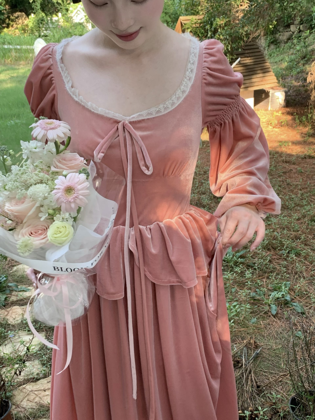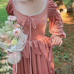 The Autumn Swan Velvet Gown captures the charm of a forgotten French romance. Made from brown velvet with a soft golden sheen, it drapes gracefully with every movement. A square neckline trimmed in ivory lace and matching lace cuffs add a touch of vintage nobility, while the gathered waist and flowing skirt recall the elegance of centuries past.