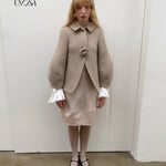 Style keywords: beige wool coat · rosette detail jacket · soft vintage outerwear · autumn neutral fashion · romantic minimalist
