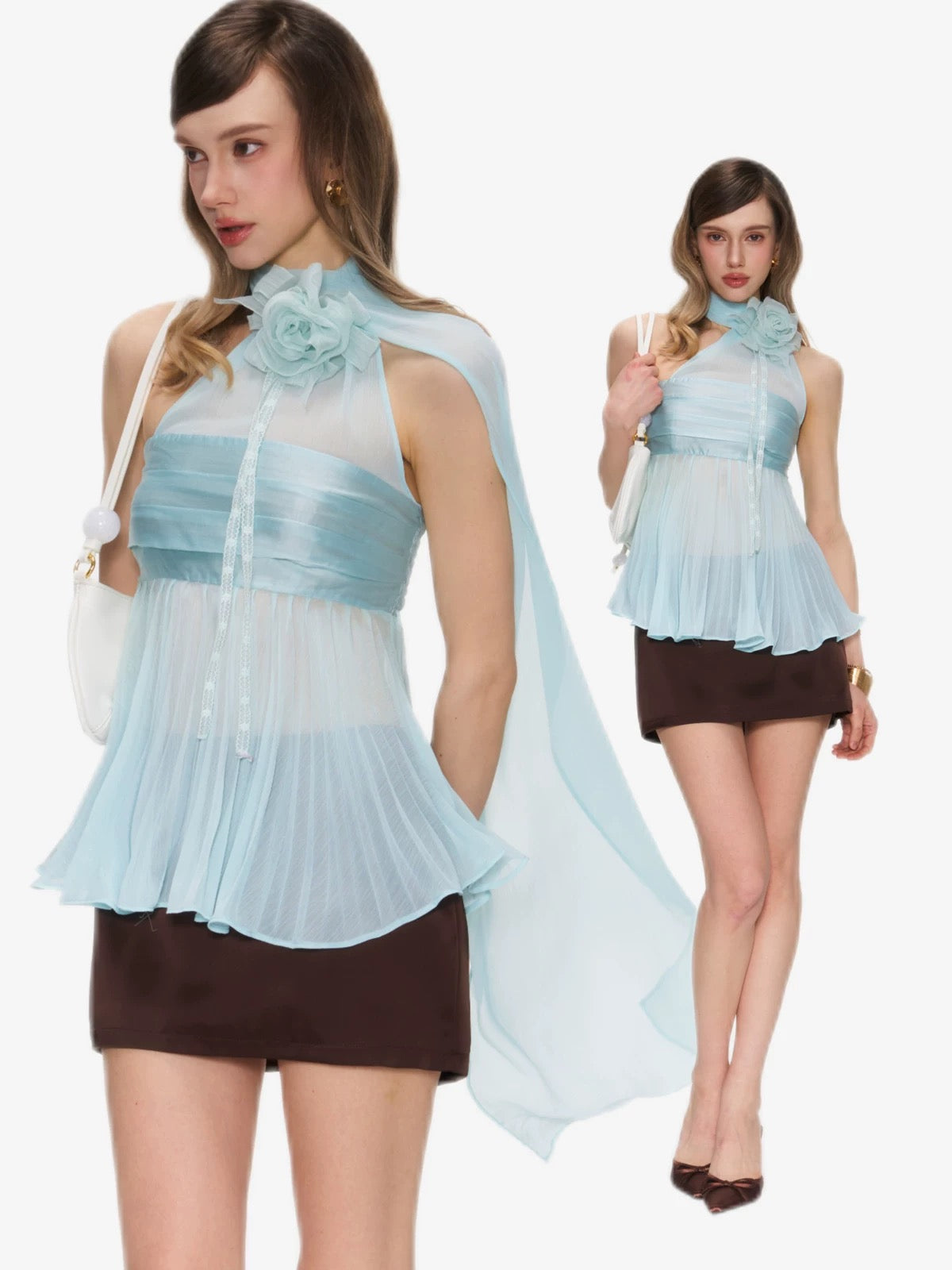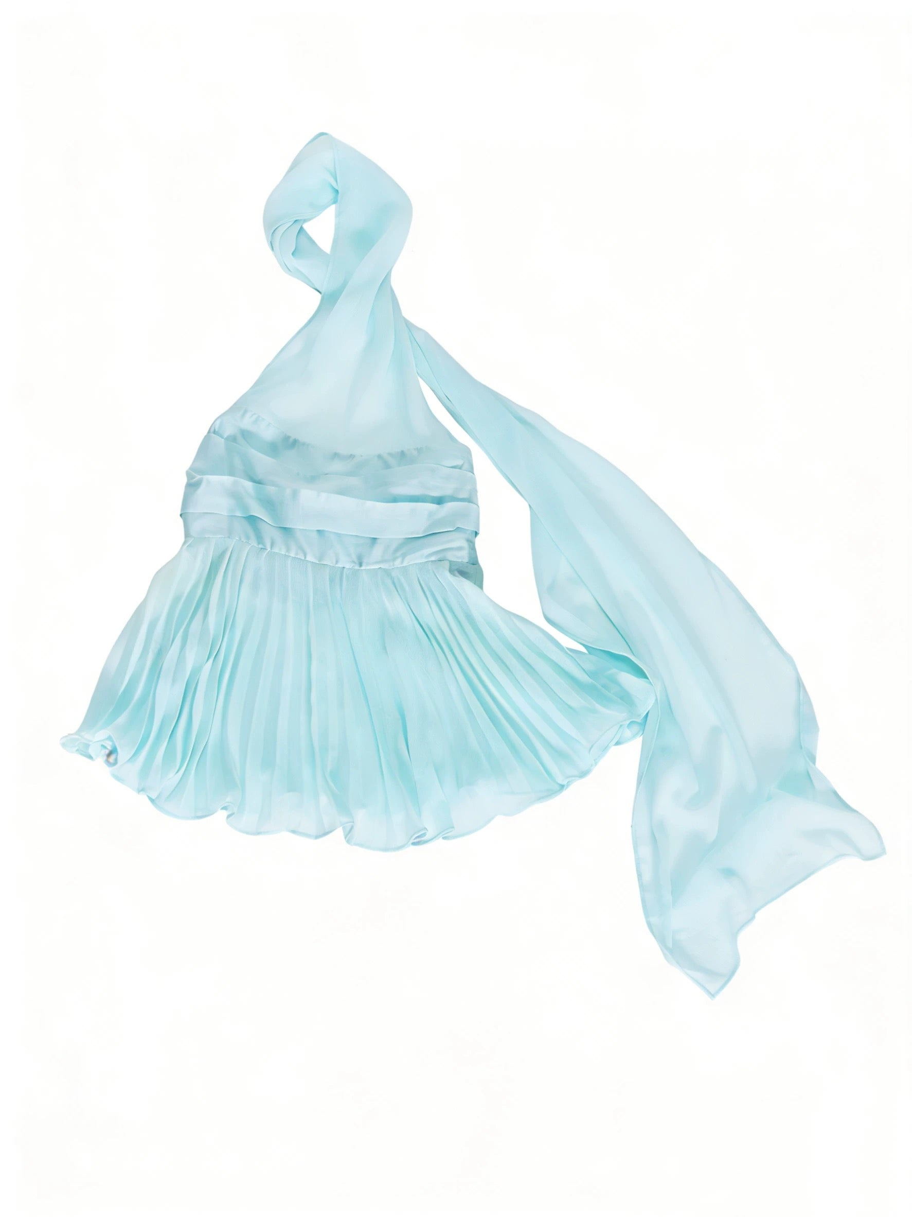 This Halter Top features a bandeau-style base with delicate pleated chiffon layered over it, creating a fluid, floating silhouette. The halter neckline is accented with a soft floral detail and long flowing ties that move gently with the body.