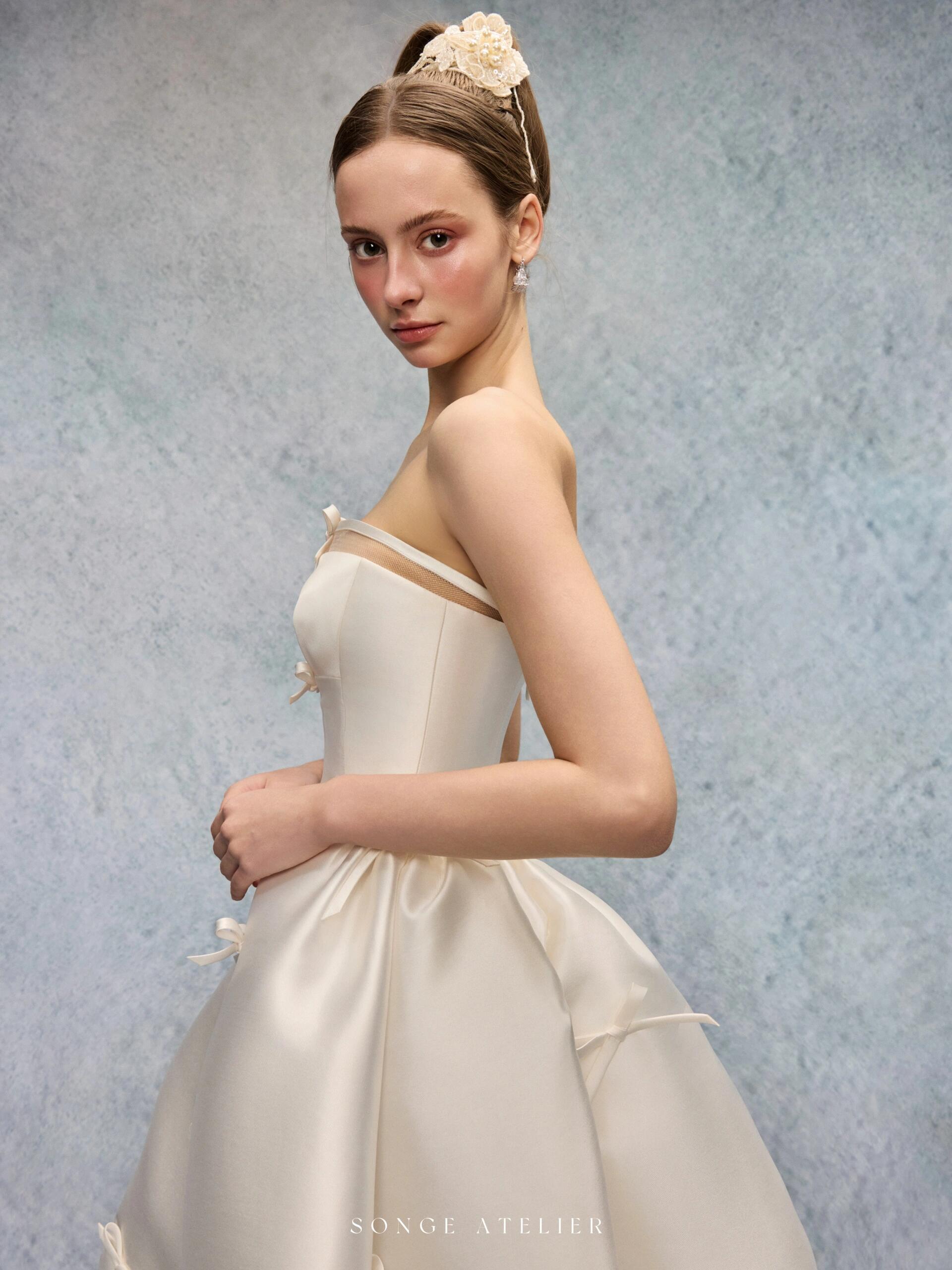 The Lettre d’Hiver Gown by Songe Atelier captures the serene magic of a snowy winter’s morning. Designed in pristine ivory, the strapless silhouette is paired with delicate satin straps and adorned with fluttering bows — each one like a snowflake caught in midair.